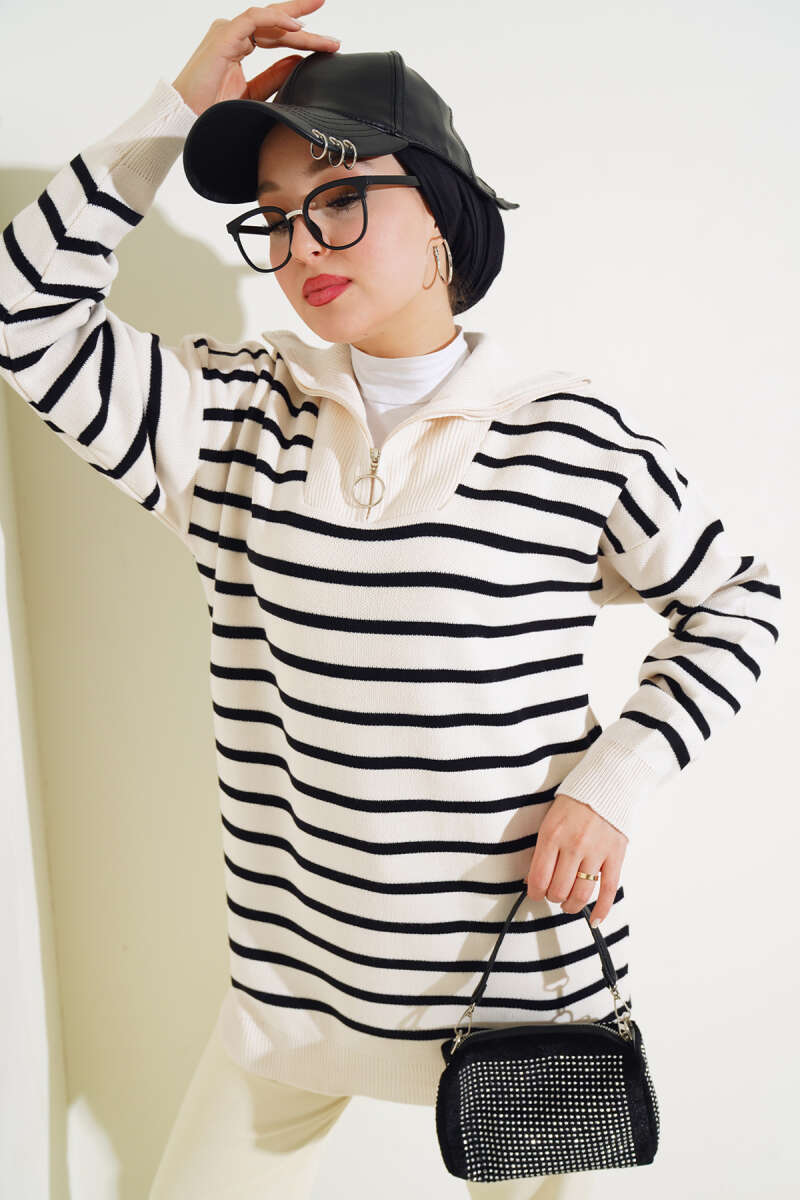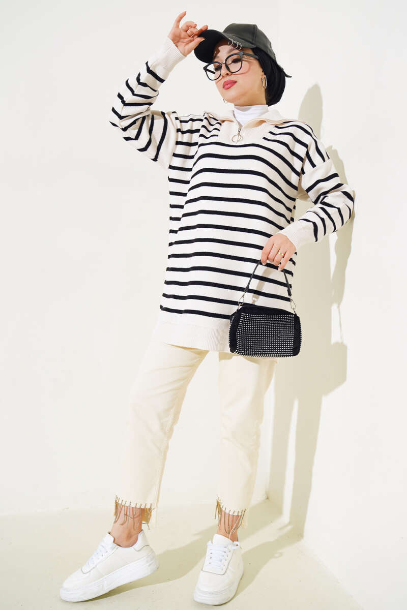 Asimetrik Kabartmalı Triko Tunik Ekru