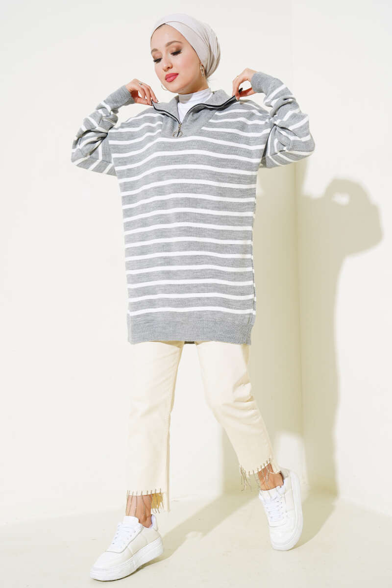 Yatay Çizgili Elbise Triko İkili Takım Gri