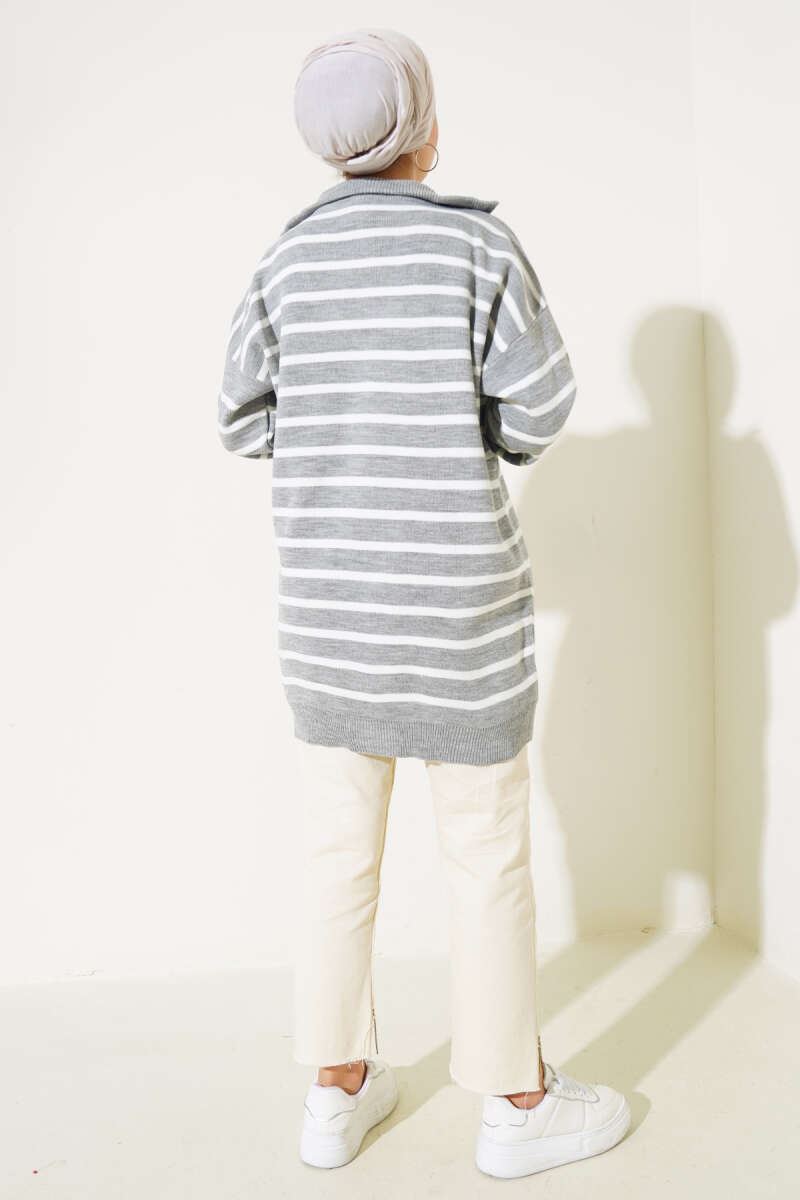 Gömlek Yaka Fularlı Triko Tunik Gri