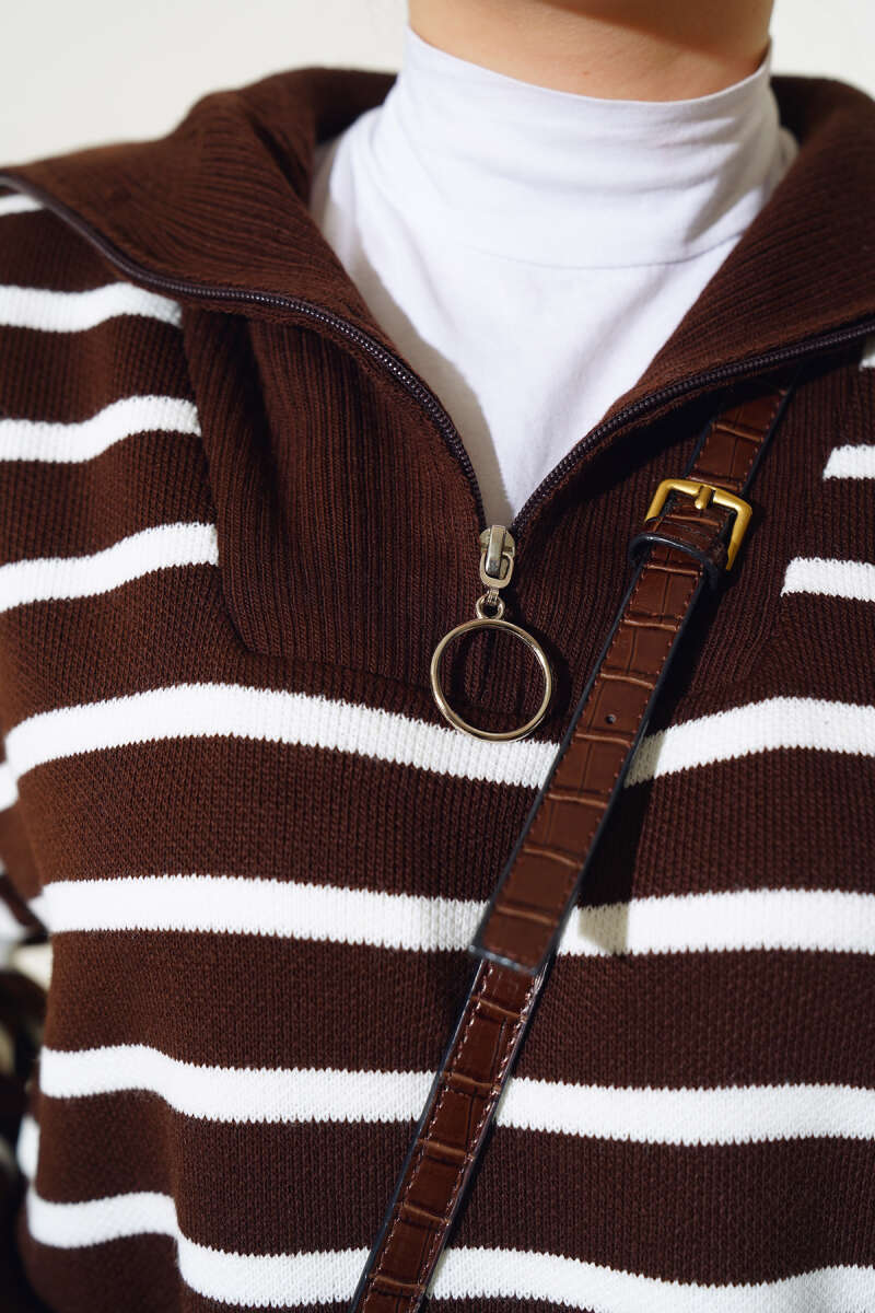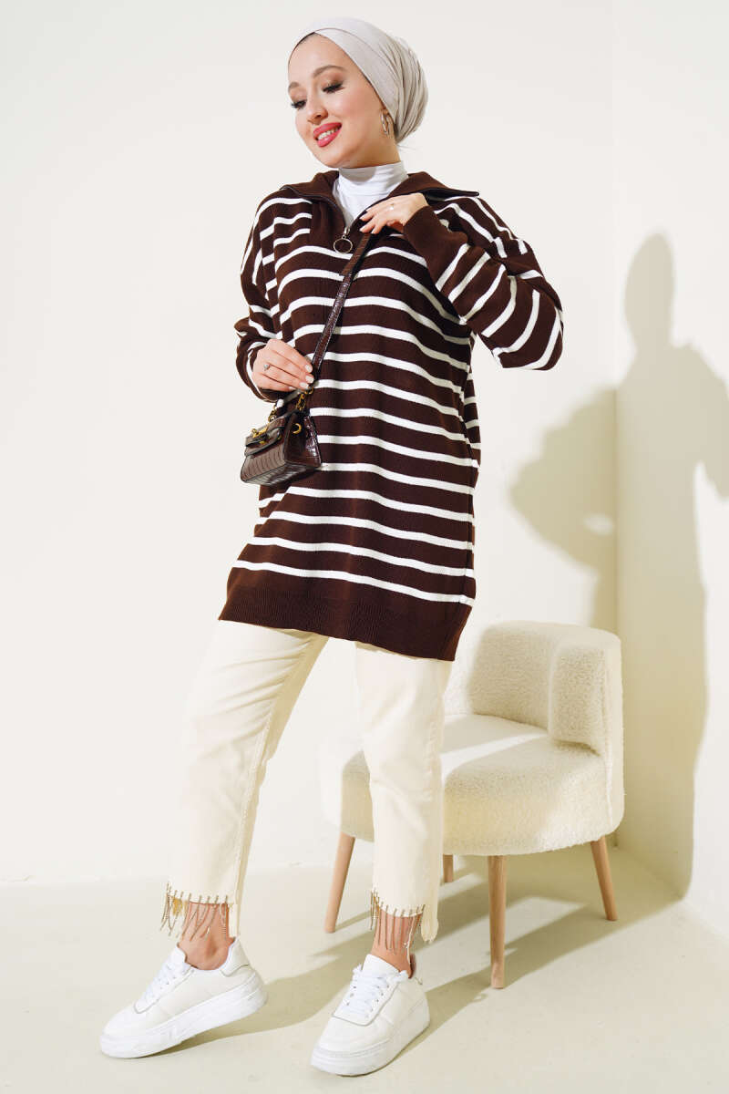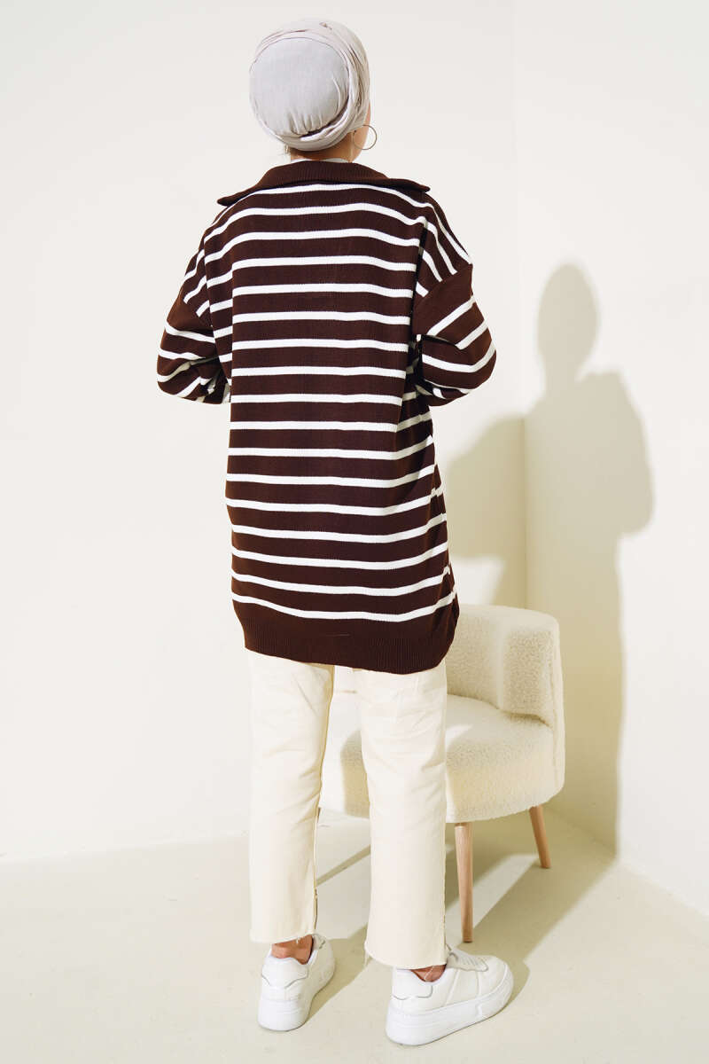 Gömlek Yaka Fularlı Triko Tunik Kahve