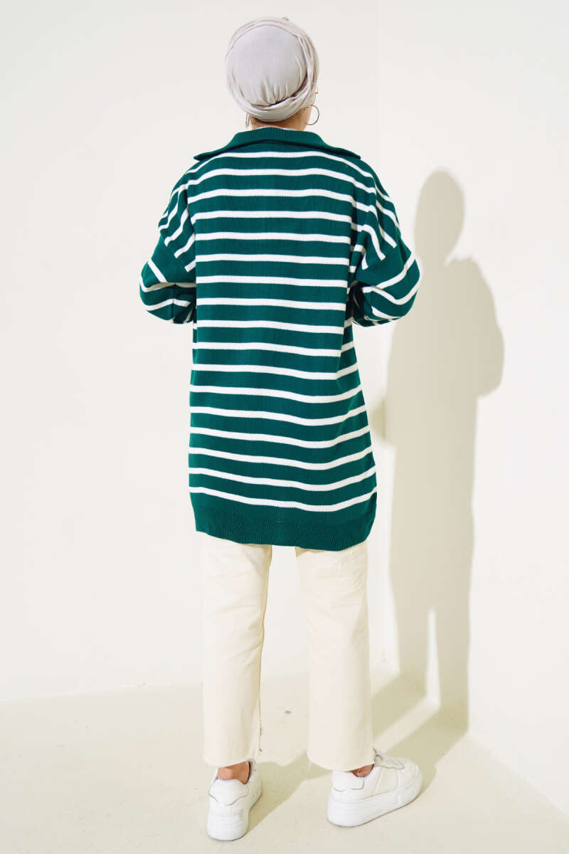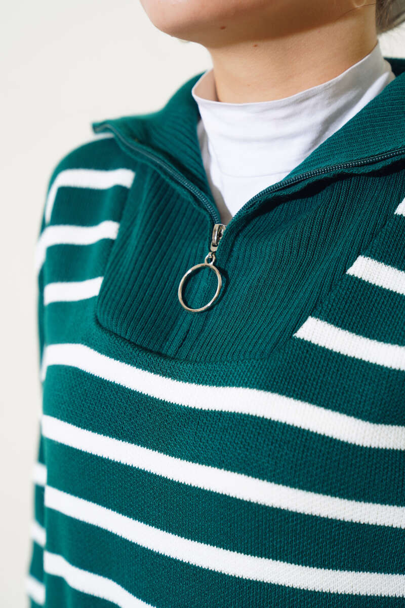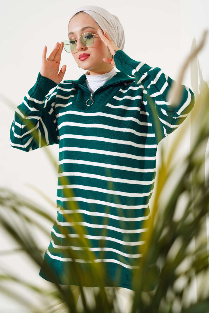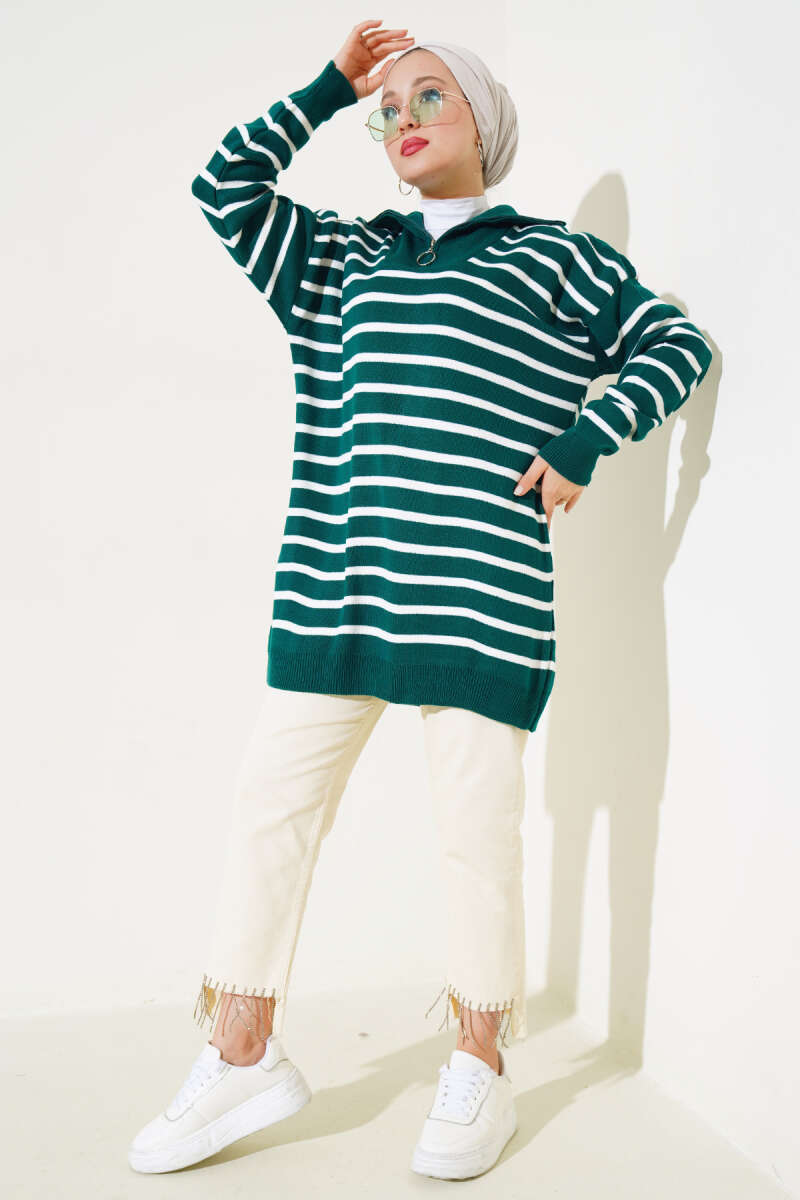 Çizgili Yakası Yarım Fermuarlı Triko Tunik Lacivert