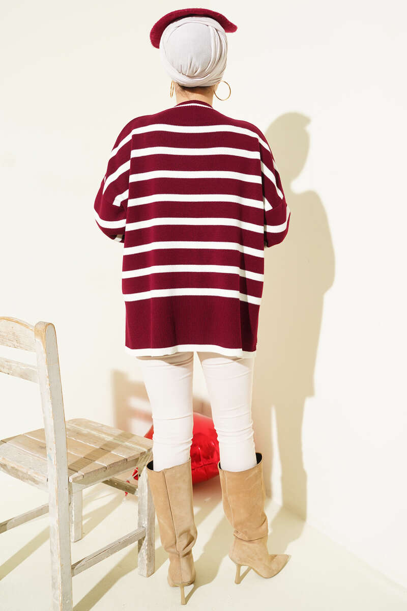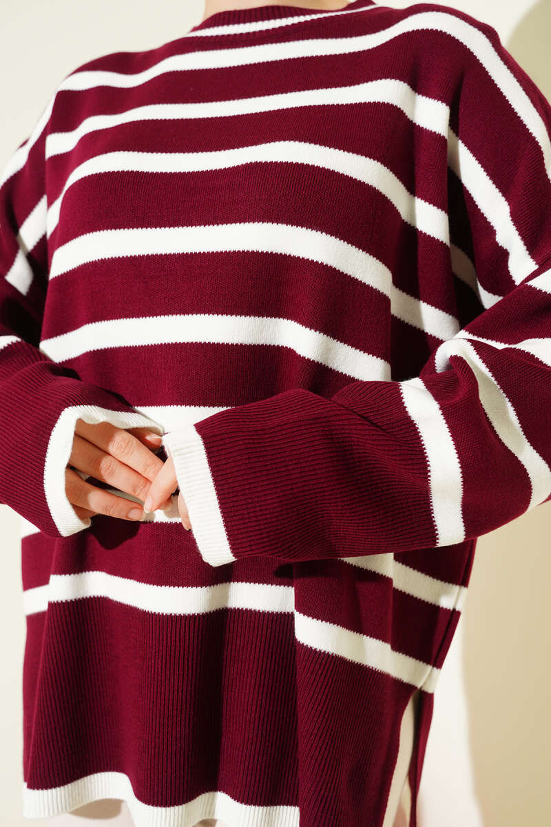Çizgili Yan Yırtmaçlı Triko Kazak Kahve