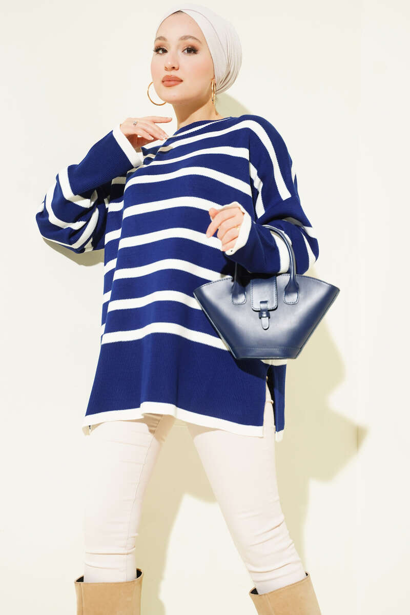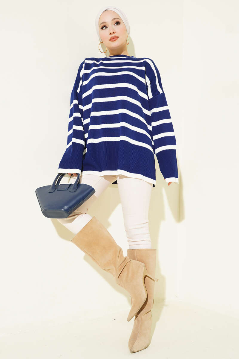Çizgili Yan Yırtmaçlı Triko Kazak Bordo