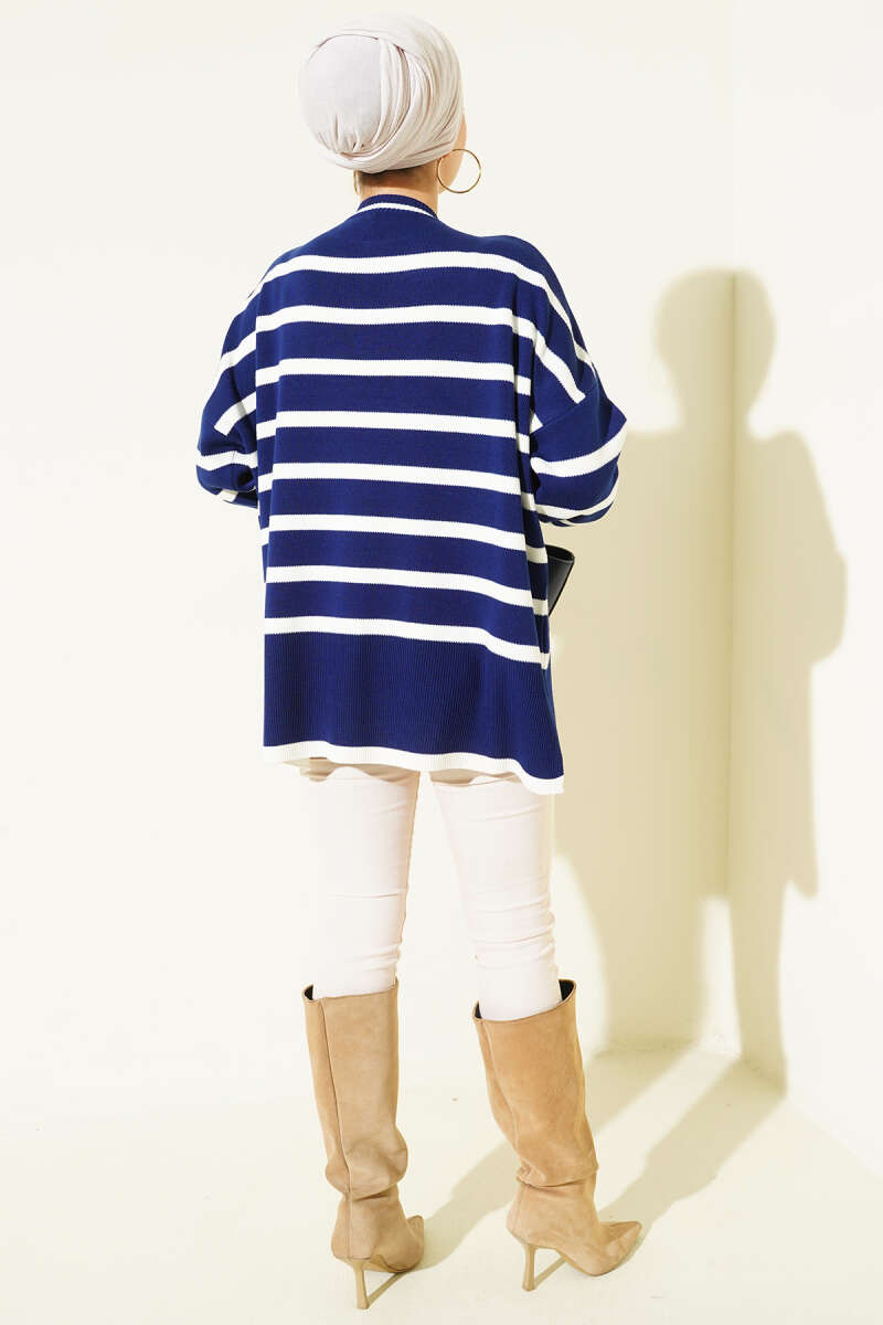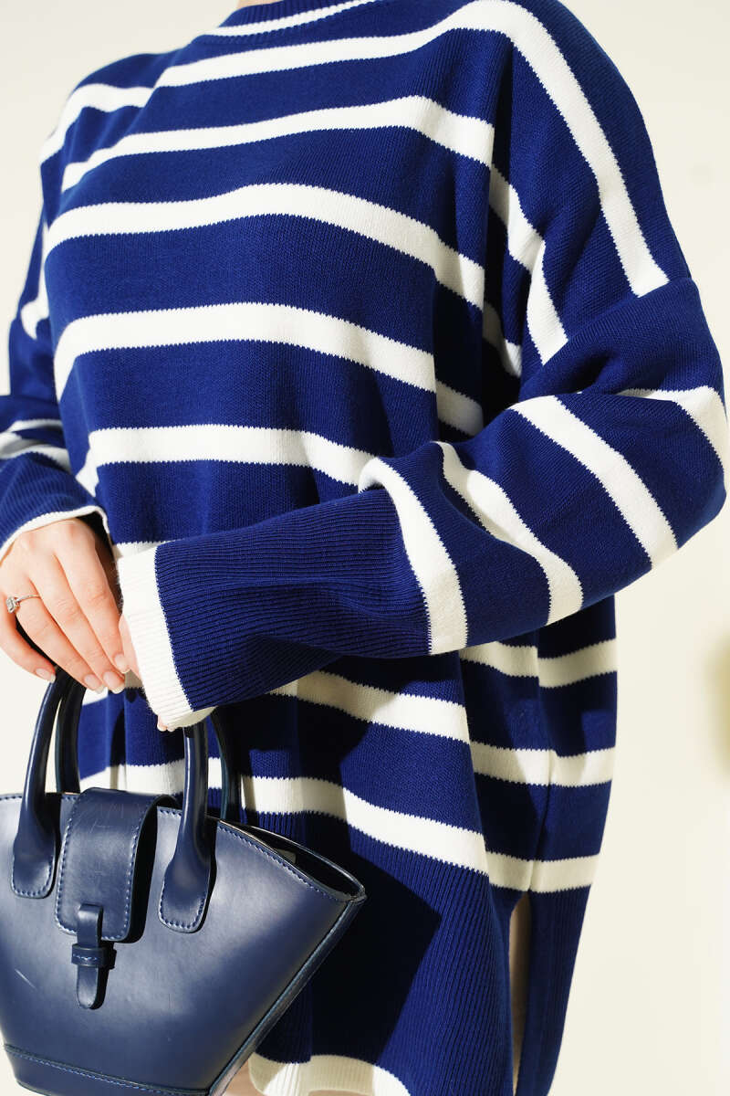 Çizgili Yan Yırtmaçlı Triko Kazak Siyah