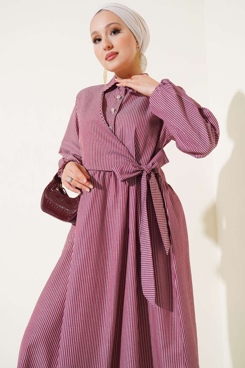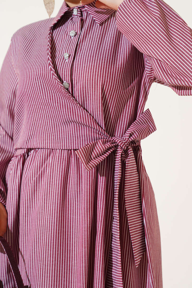 Çizgili Yarım Düğmeli Bağlamalı Elbise Bordo