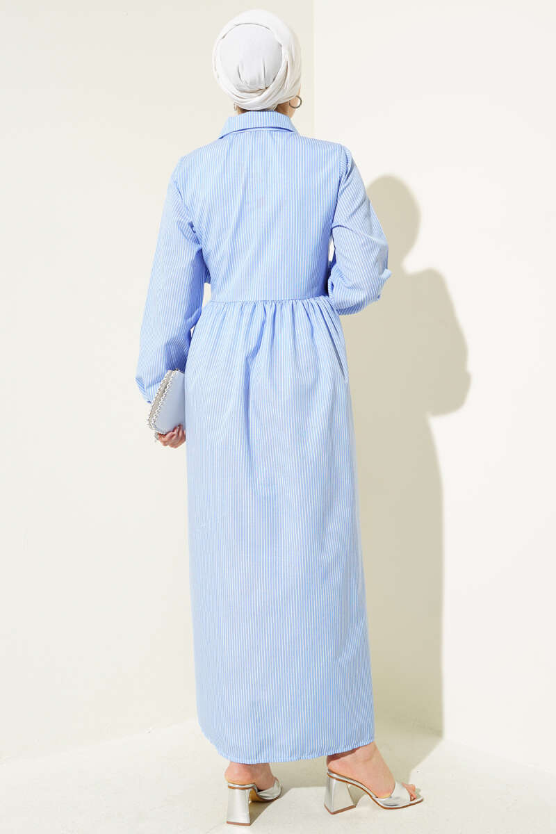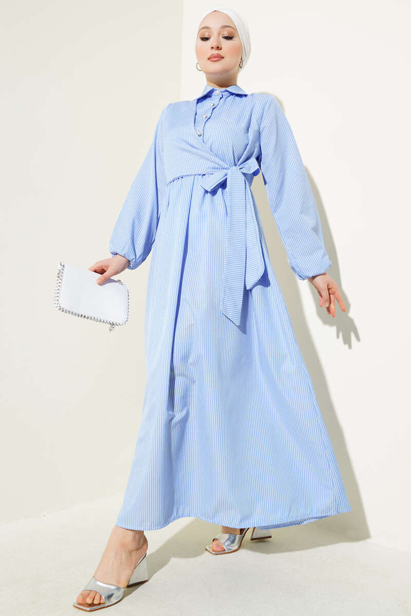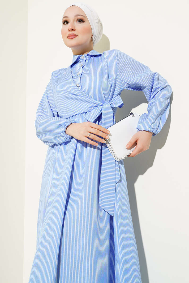 Çizgili Yarım Düğmeli Bağlamalı Elbise Mavi