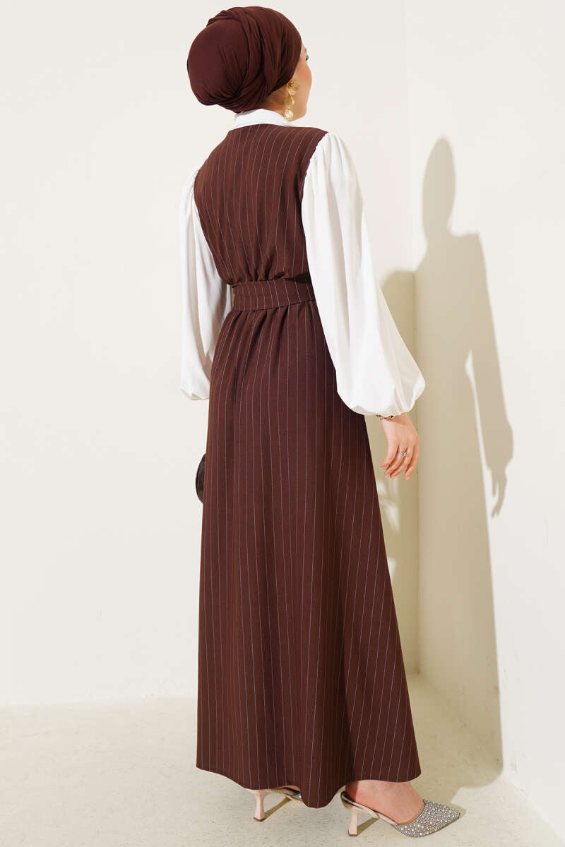 Çapraz Düğmeli Kemerli Yelekli İkili Takım Kahve