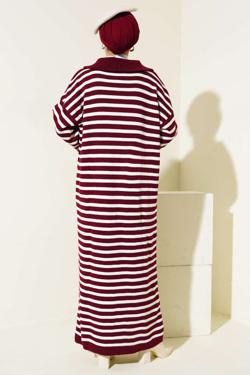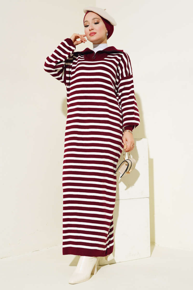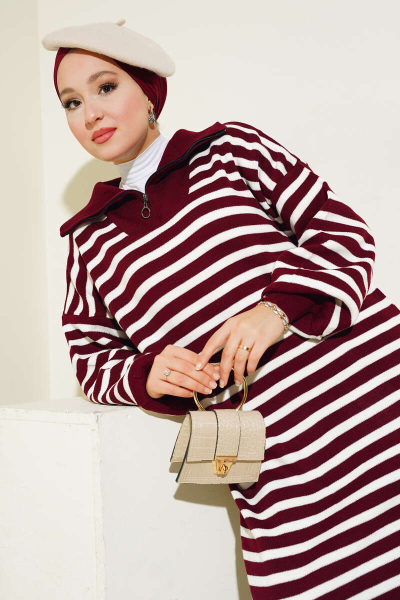 Çizgili Yarım Fermuarlı Triko Elbise Bordo