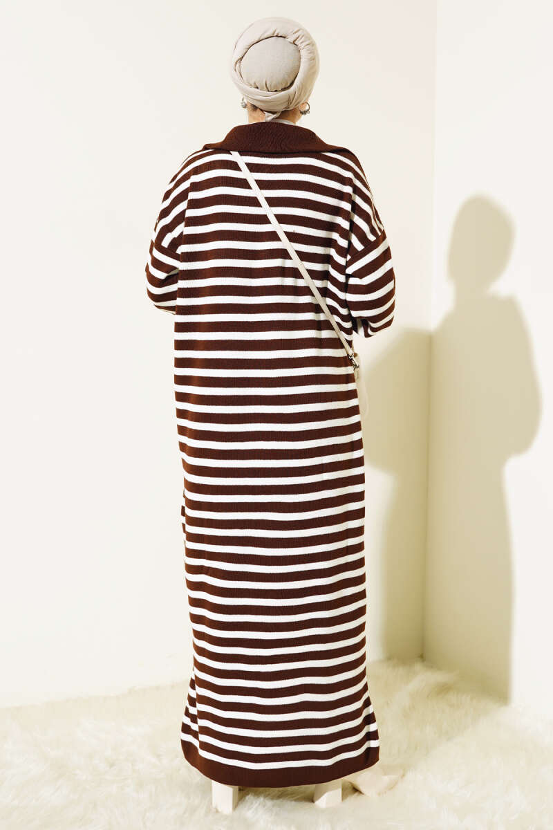Çizgili Yarım Fermuarlı Triko Elbise Kahve