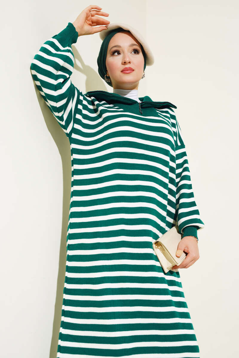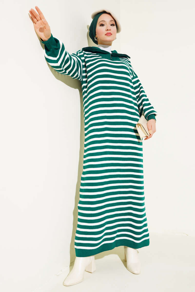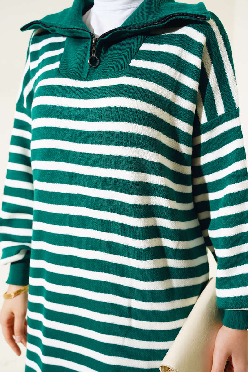 Çizgili Yarım Fermuarlı Triko Elbise Nefti