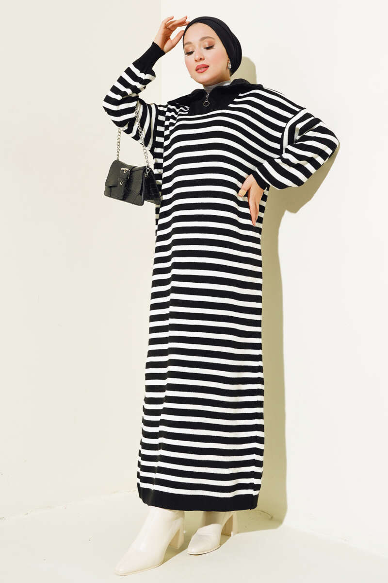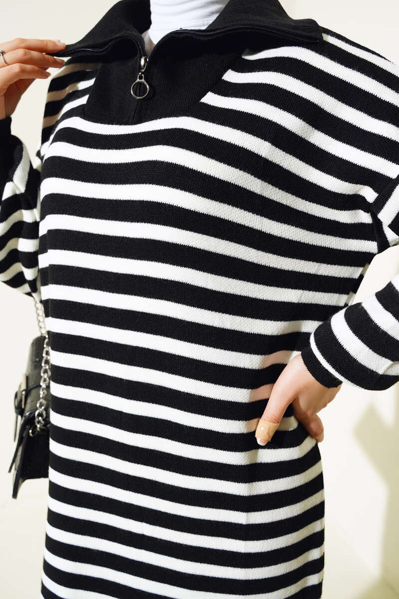 Çizgili Yarım Fermuarlı Triko Elbise Siyah