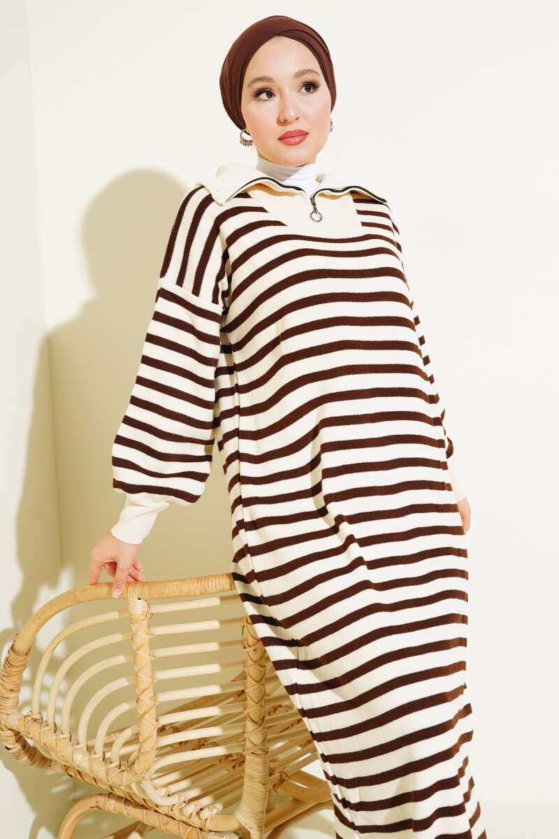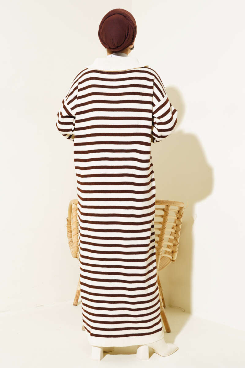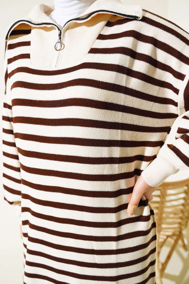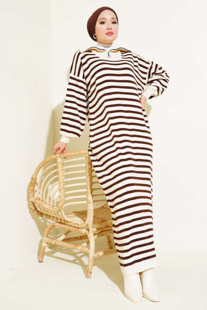 Çizgili Yarım Fermuarlı Triko Elbise Taş