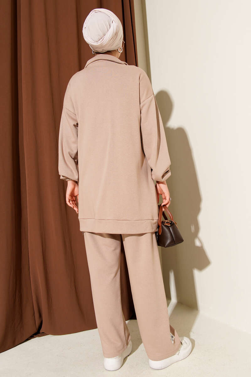 Hakim Yaka Bel Tünelli Desenli Elbise Kahve