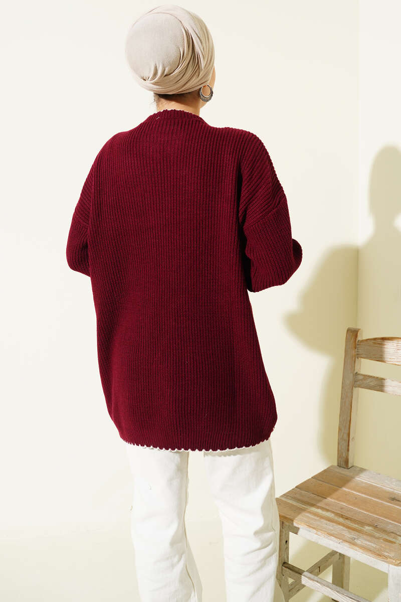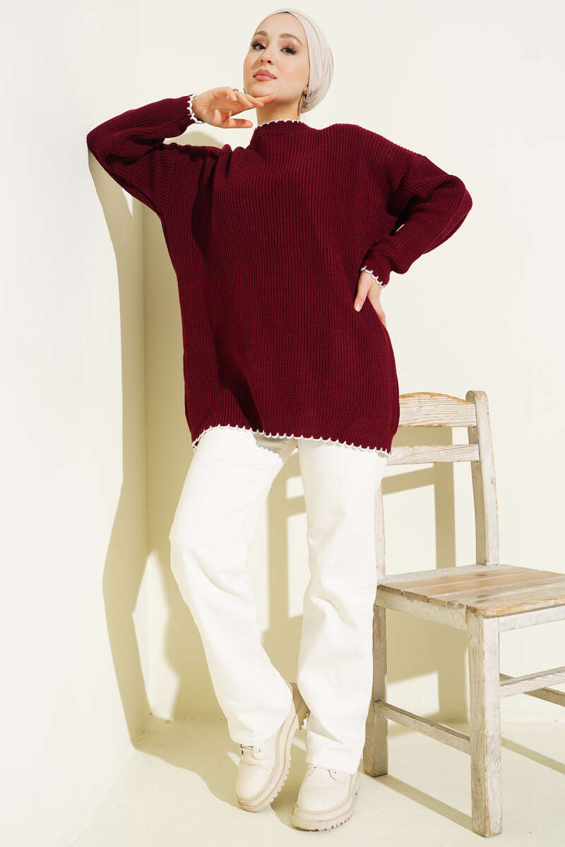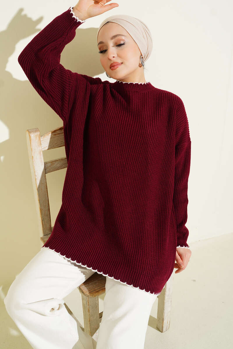 Basic Yatay Çizgi Detaylı Triko Tunik Bordo