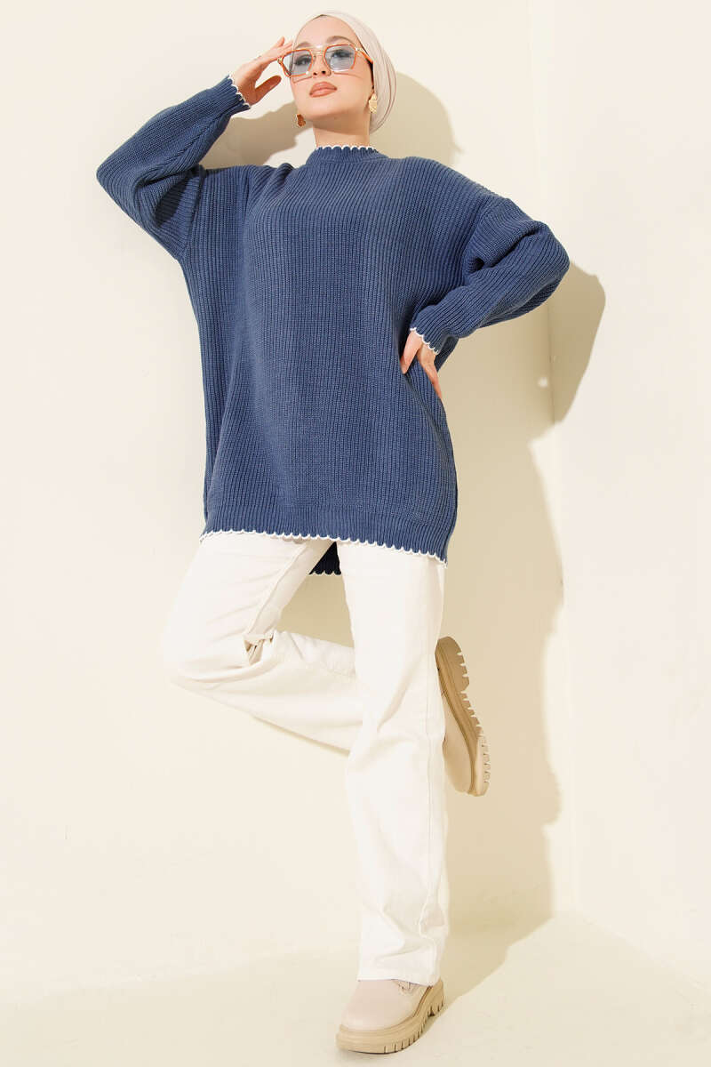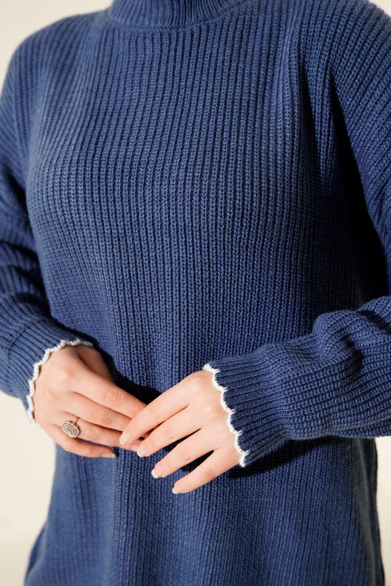 Bilek Düğmeli Fitilli Triko Tunik Mavi
