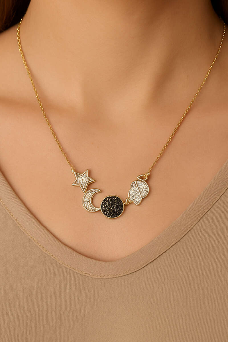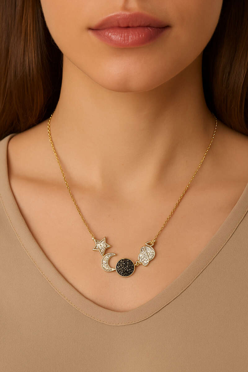 Oval Taşlı Detaylı Zincir Kolye Gold