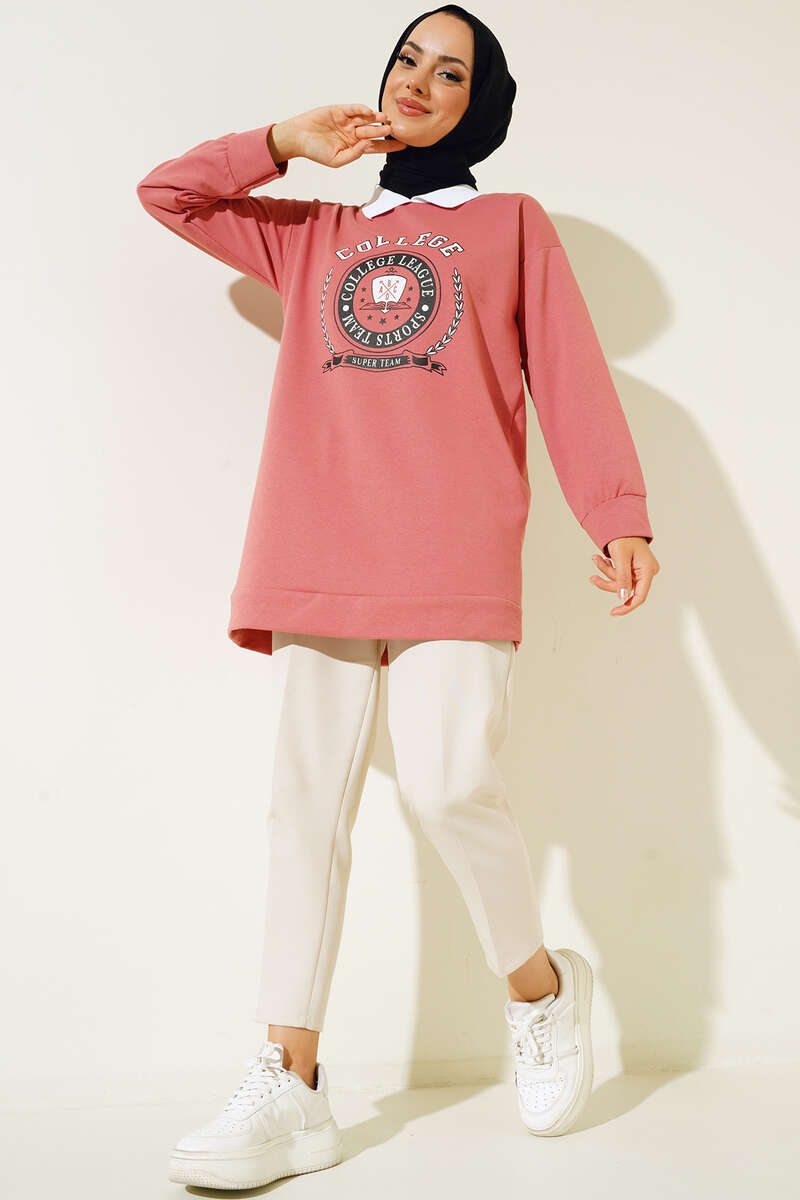 Yeni sezon tuniğimiz sportif bir görünüm sunarken şık bir kombin yapmanıza da olanak sağlamaktadır. Önü college baskılı tuniğimiz klasik yakadır. Düşük omuz model olan tuinğimiz sezonun favorilerindedir.