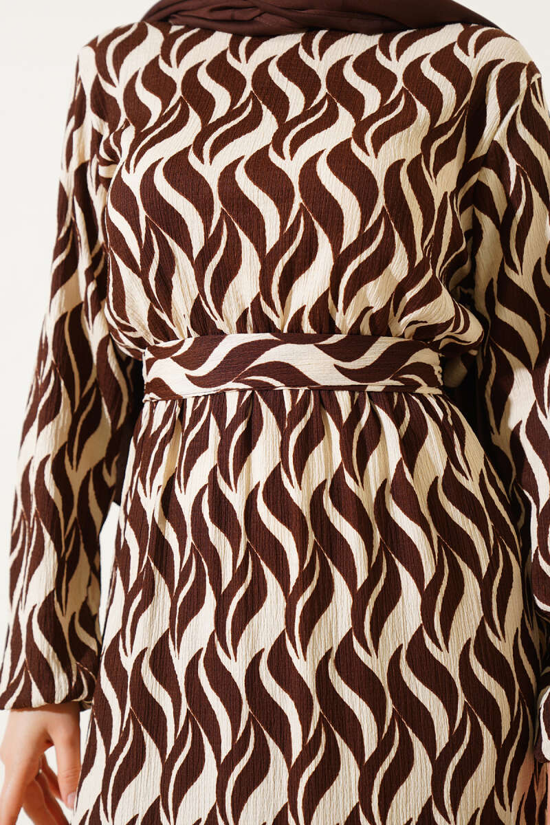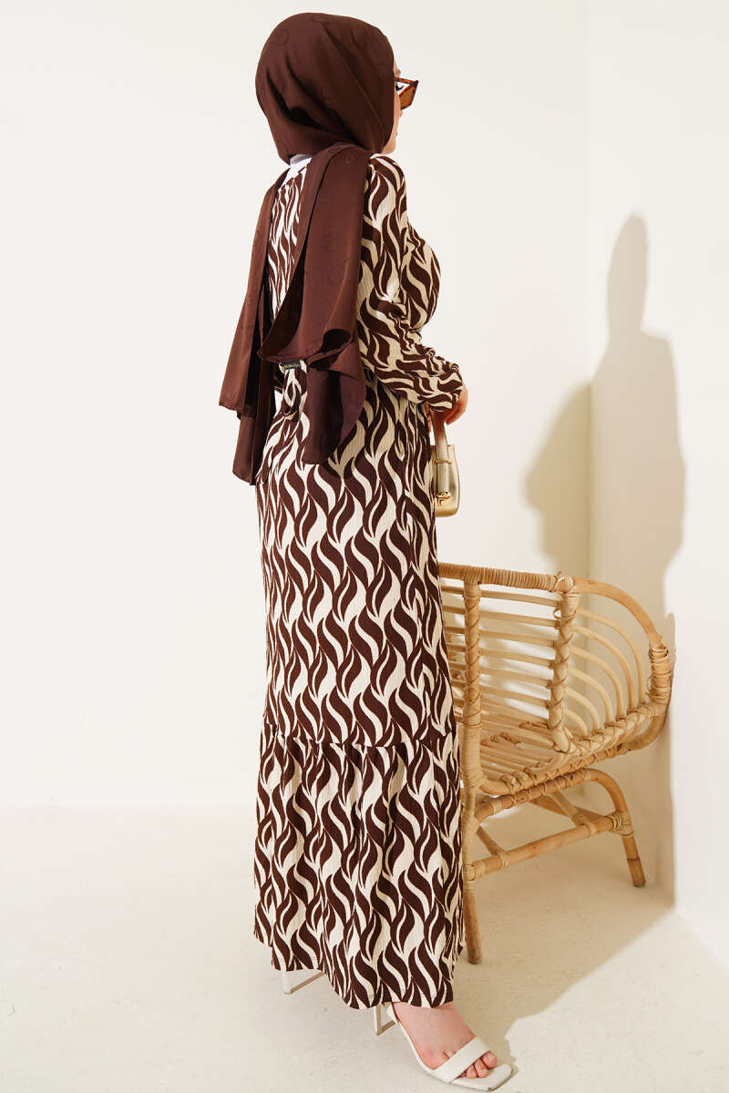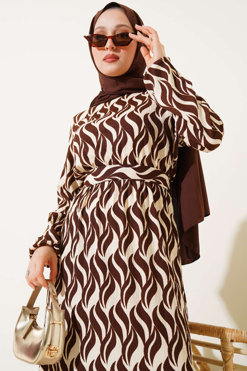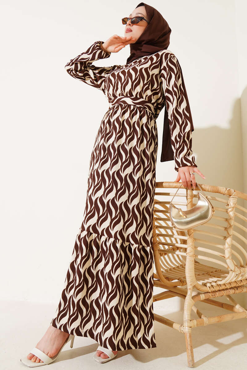Kuşaklı Ekose Desenli Kloş Elbise Kahve