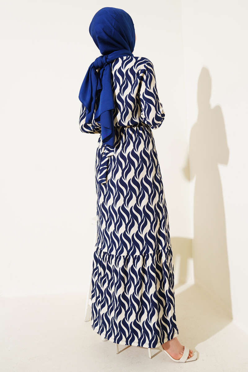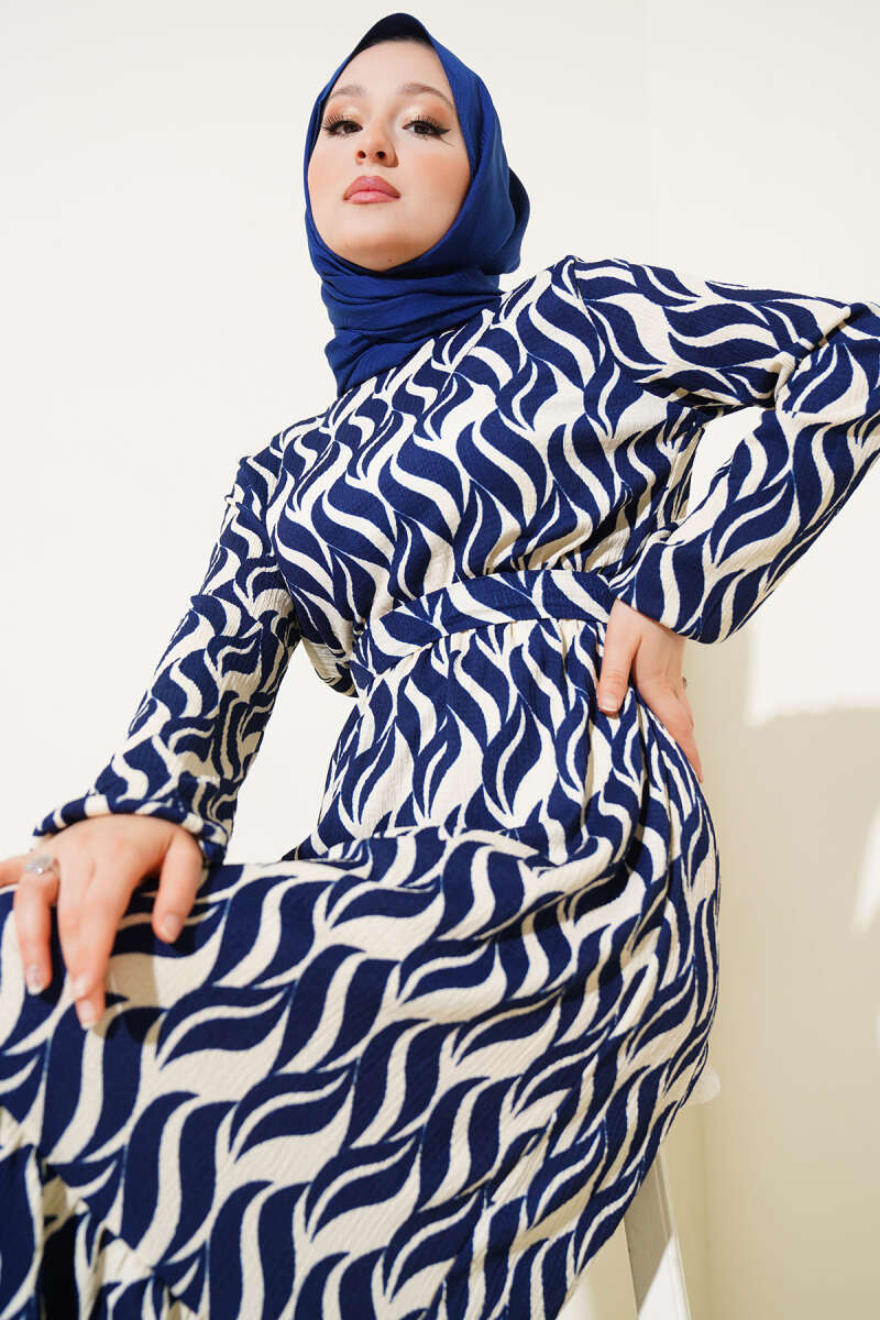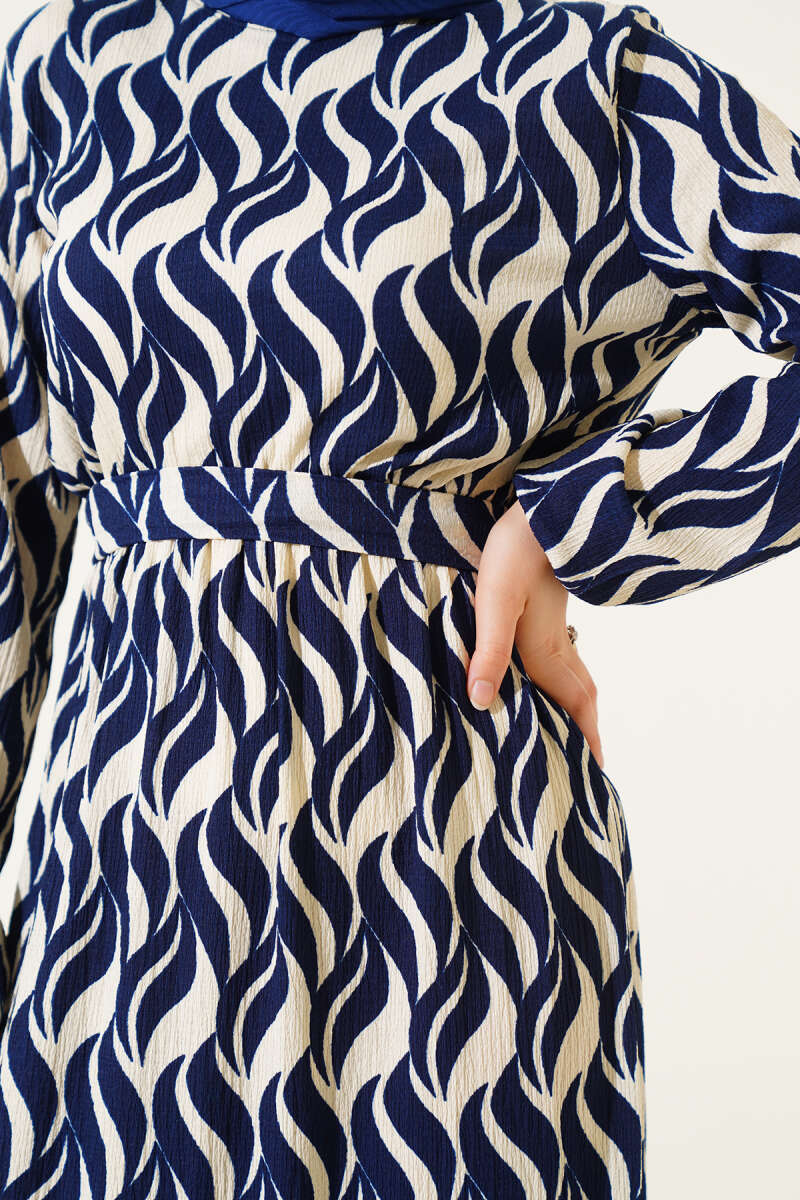 Kuşaklı Ekose Desenli Kloş Elbise Lacivert
