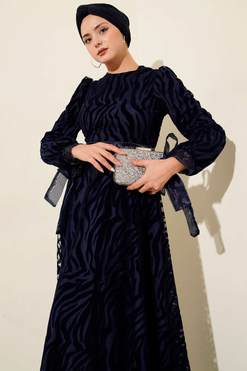 Dalga Desen Tül Kuşak Abiye Elbise Siyah