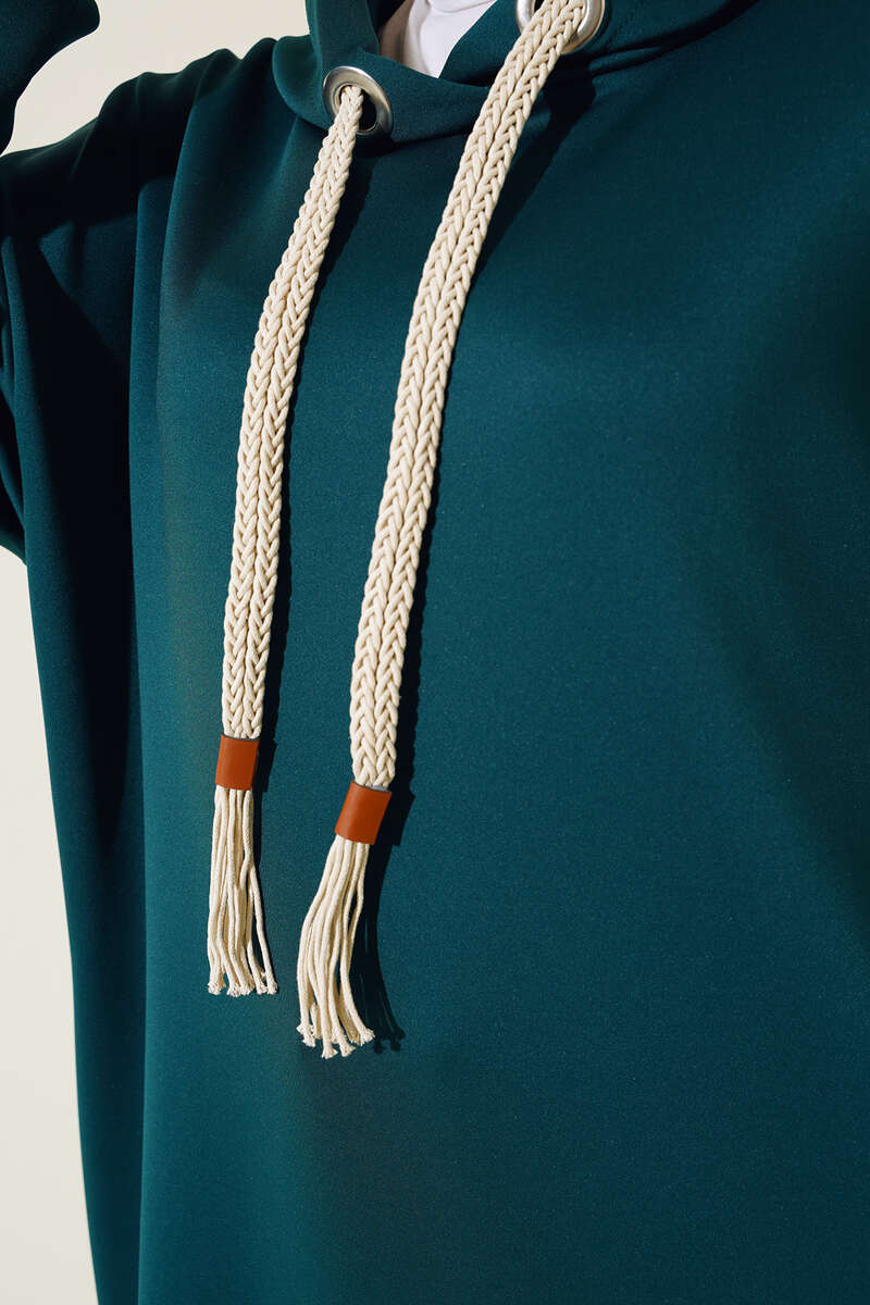 Dalgıç kumaş tuniğimiz uzun olup kapüşonlu modeldir. Yan kısımlarında iki adet aktif olarak kullanılabilen cepleri mevcuttur. Yakasında bulunan hasır ip detayları ile dikkat çeken tuniğimiz düşük omuzludur.