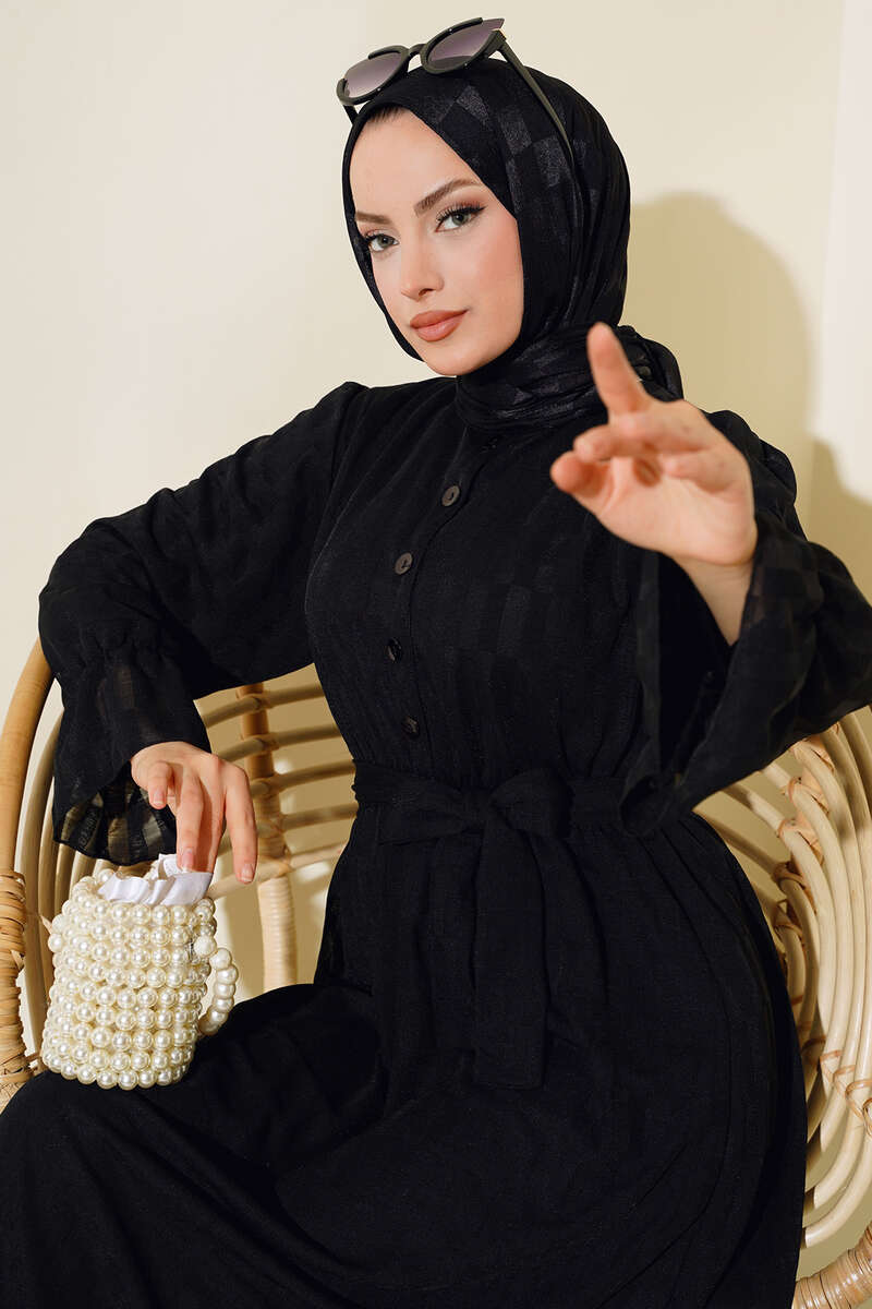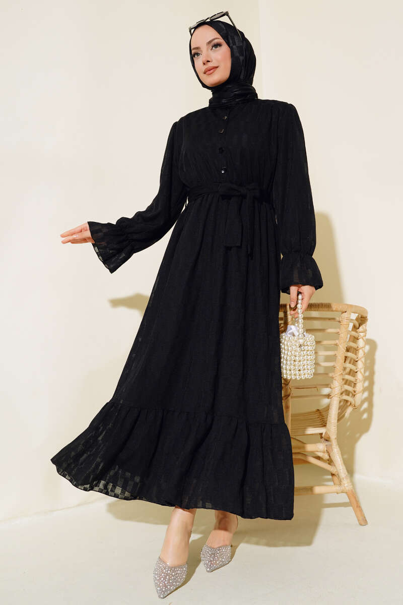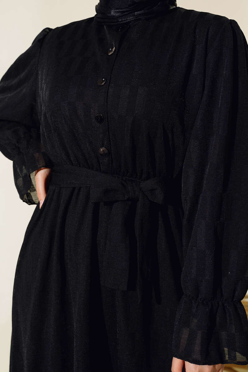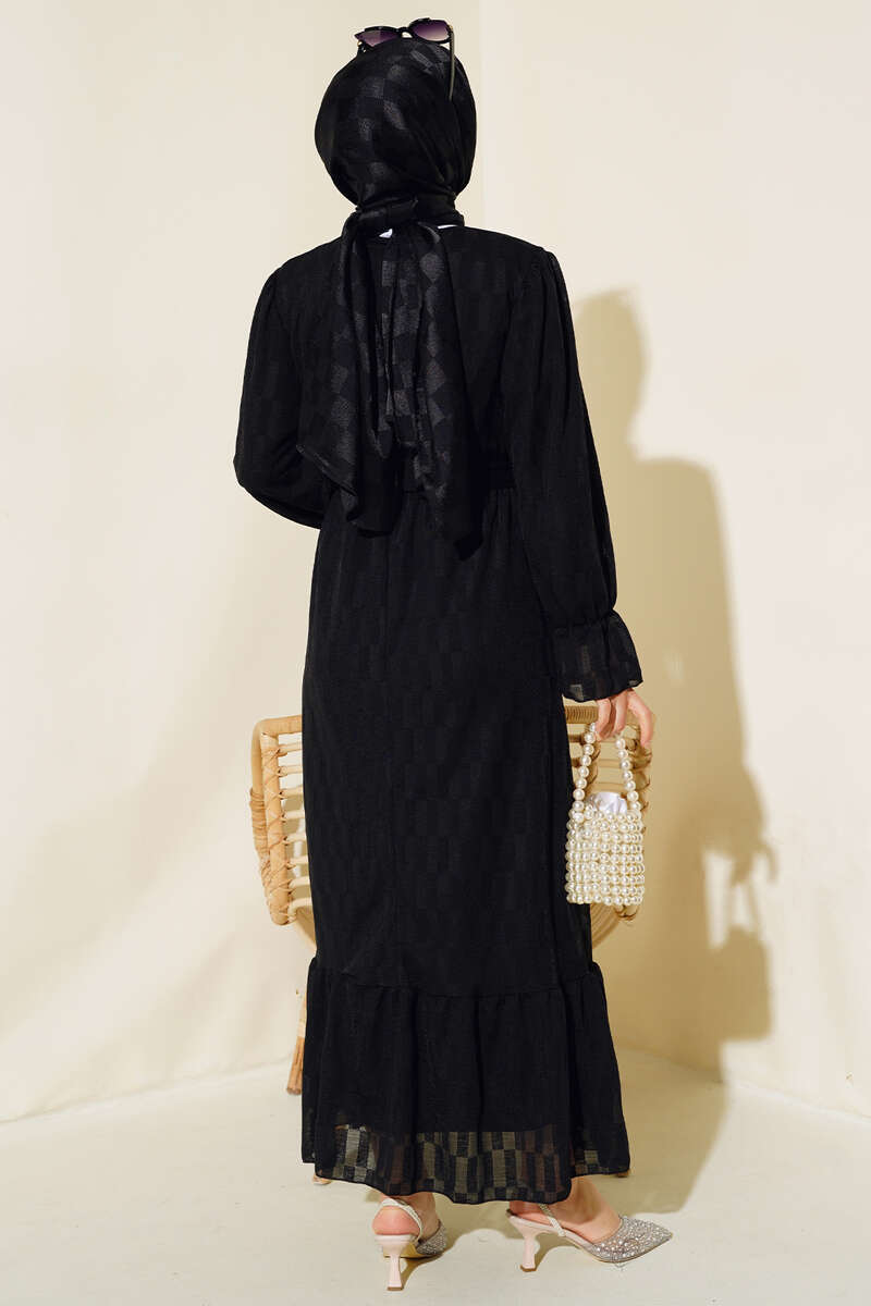 Dama Desen Jakarlı Elbise Siyah