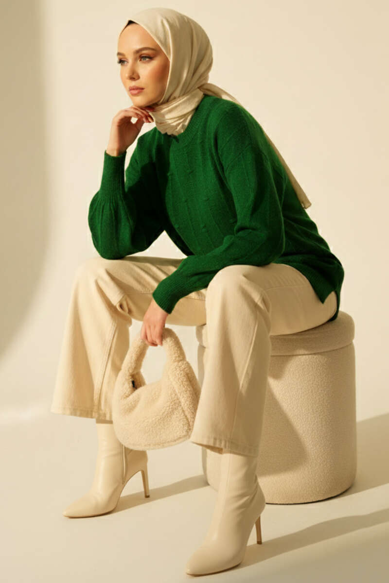 Önü Fırfırlı Triko Kazak Ekru