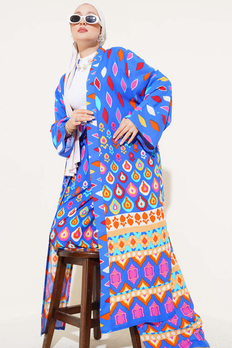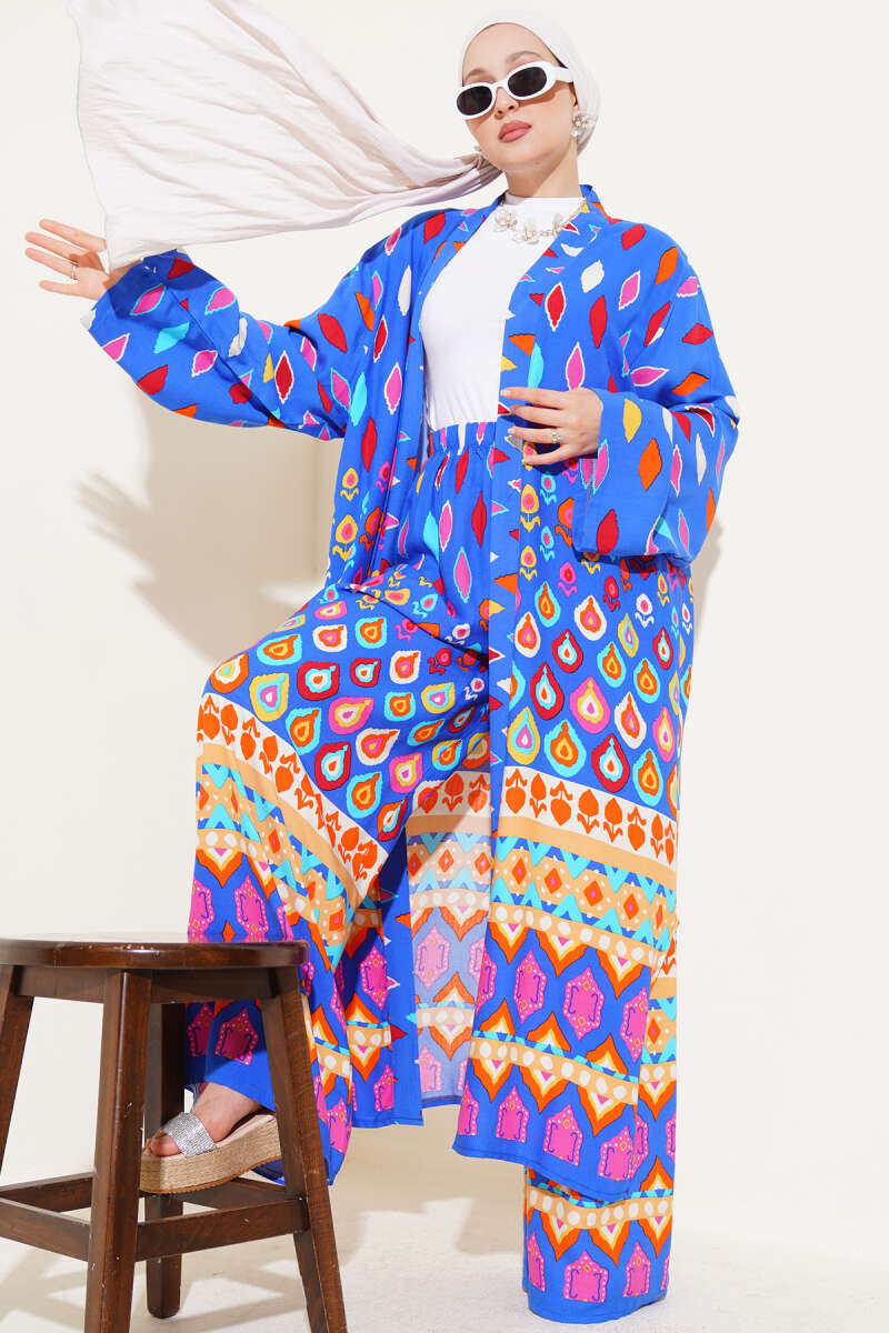 Damla Desenli Uzun Kimonolu İkili Takım Saks