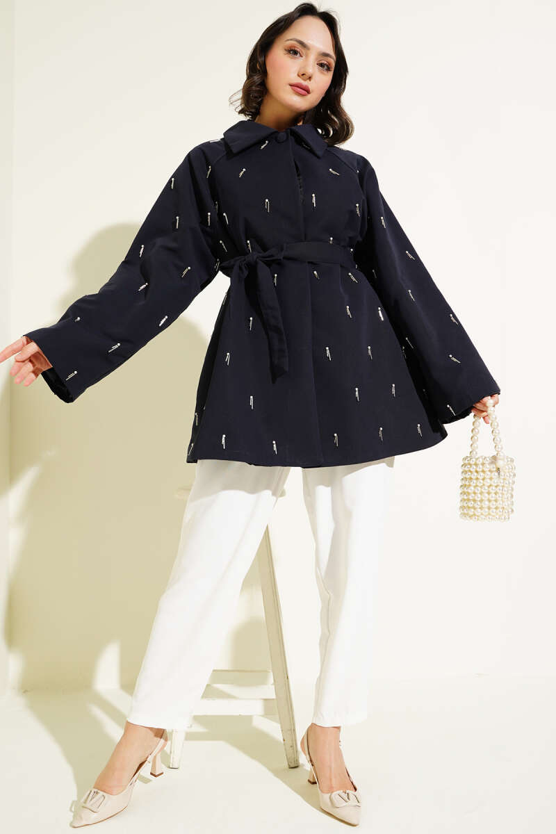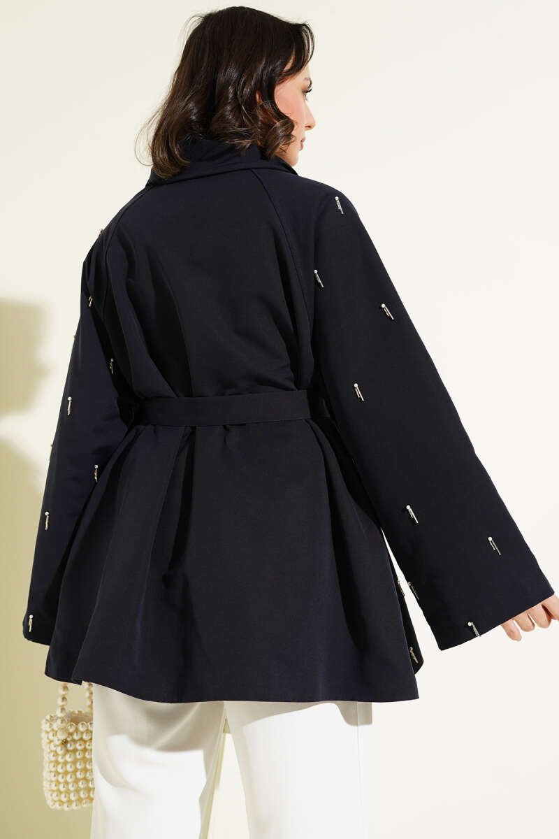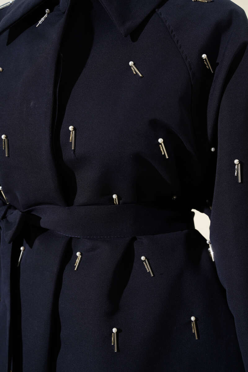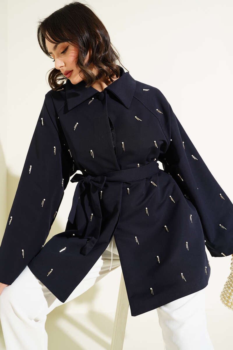 Damla İncili Kuşaklı Düğmeli Ceket Lacivert