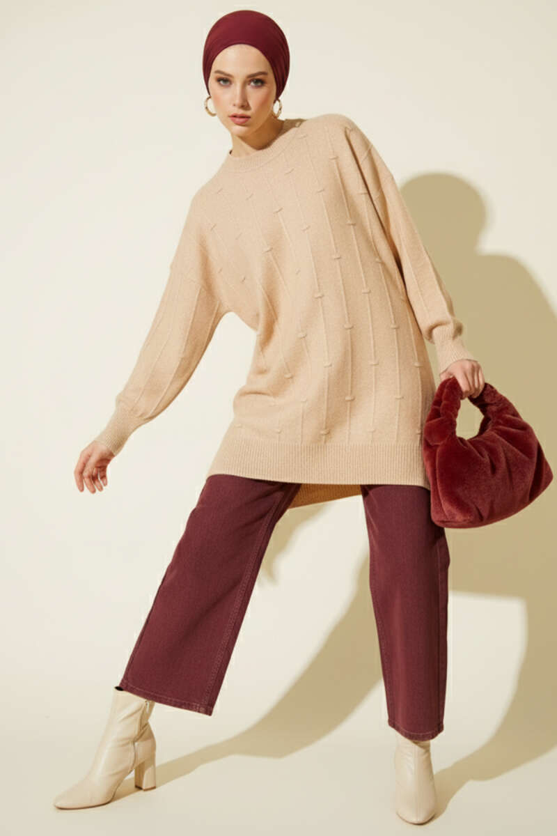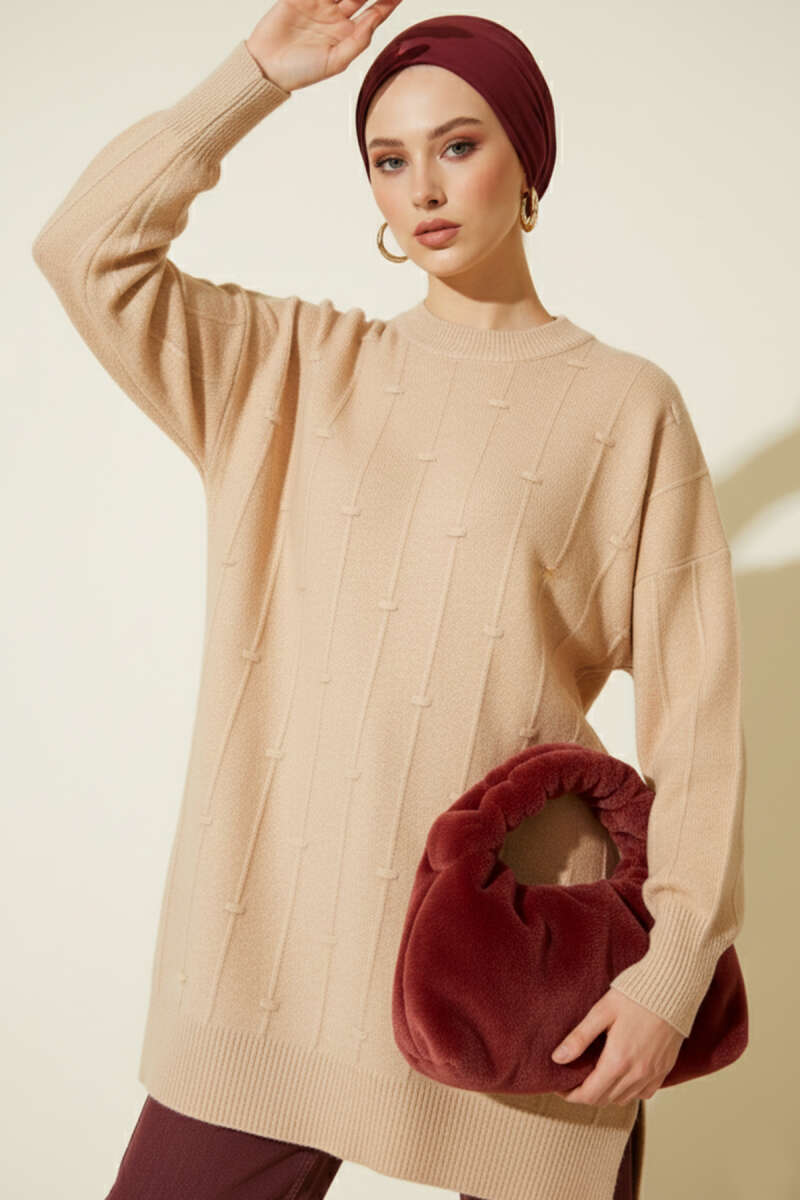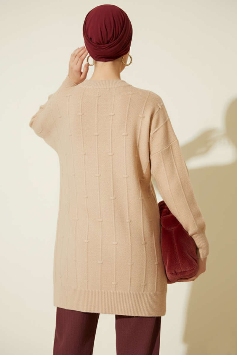 Ajurlu İp Kuşaklı Triko Elbise Bej