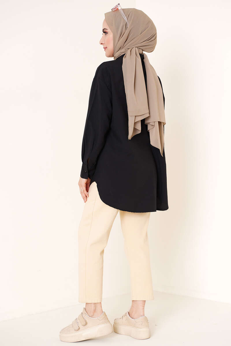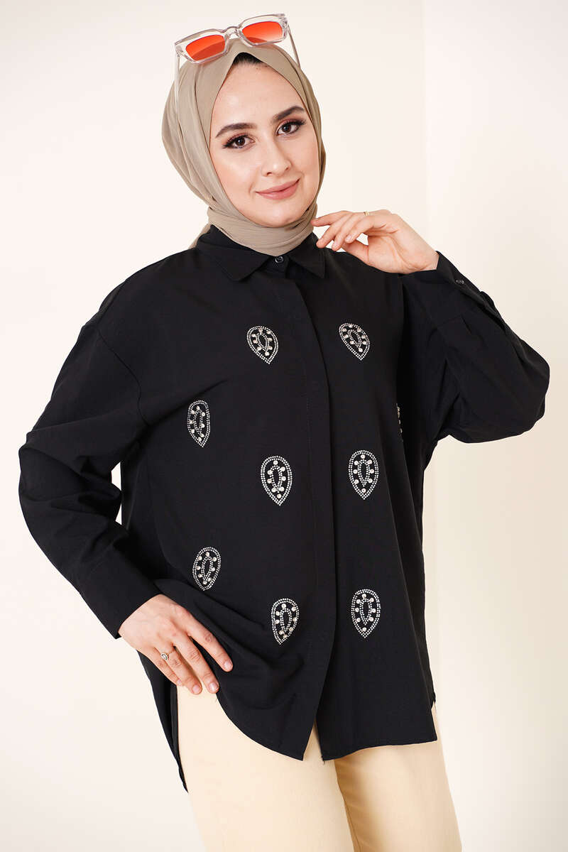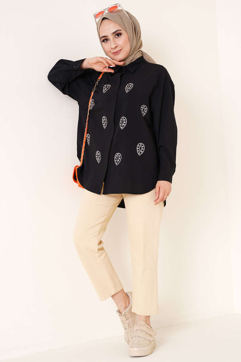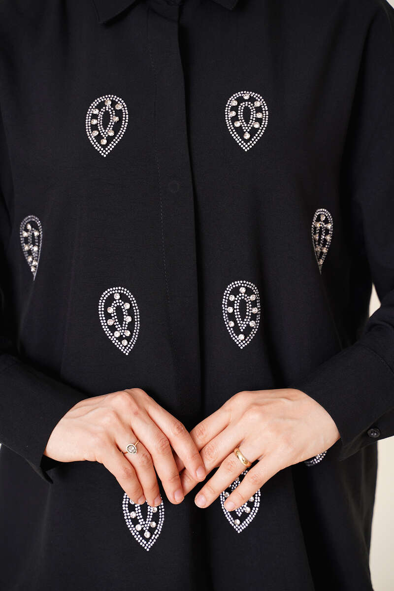 Yeni sezon gömleğimiz üzerinde bulunan damla şeklinde pırlanta taşlarıyla beğenileri toplamakta. Salaş görünümüyle rahatlığını ön planda tutan herkesin ilk tercihi olacaktır. Düşük omuz model olan gömleğimizin etek ucu oval kesimdir. Gömleğimizin arkası önünden uzundur.