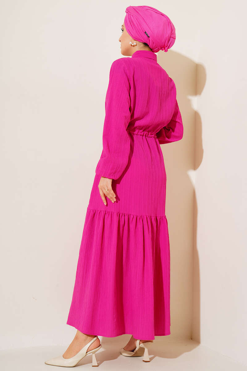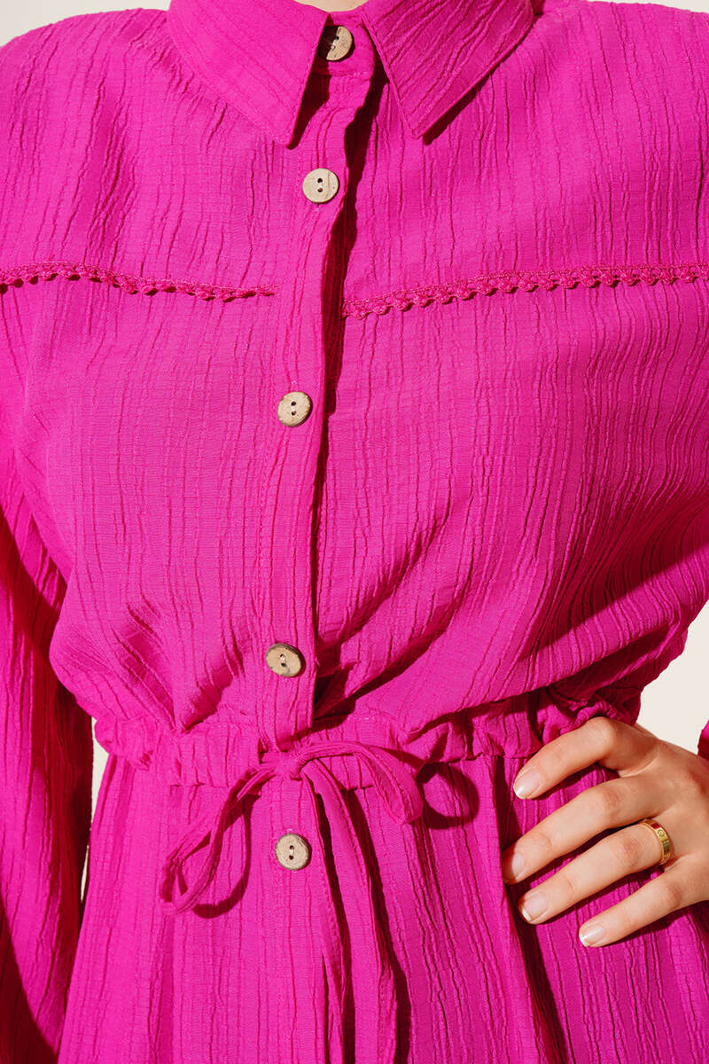 Dantel Detaylı Boydan Düğmeli Elbise Fuşya