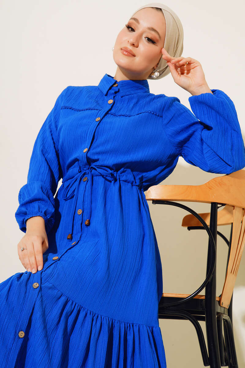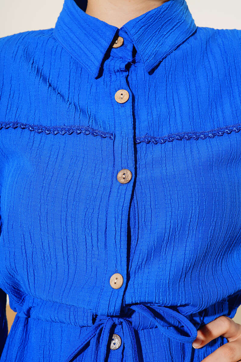 Yeni sezon elbisemiz boydan düğmelidir. Klasik yaka olan elbisemizin bilekleri lastikldiir. Beli tünelli ip bağlamalı olan elbisemiz göğüsnde dantel detayı bulunmaktadır.