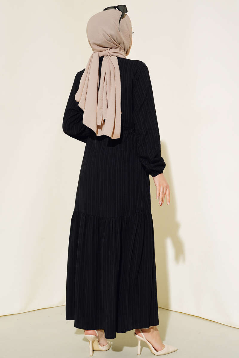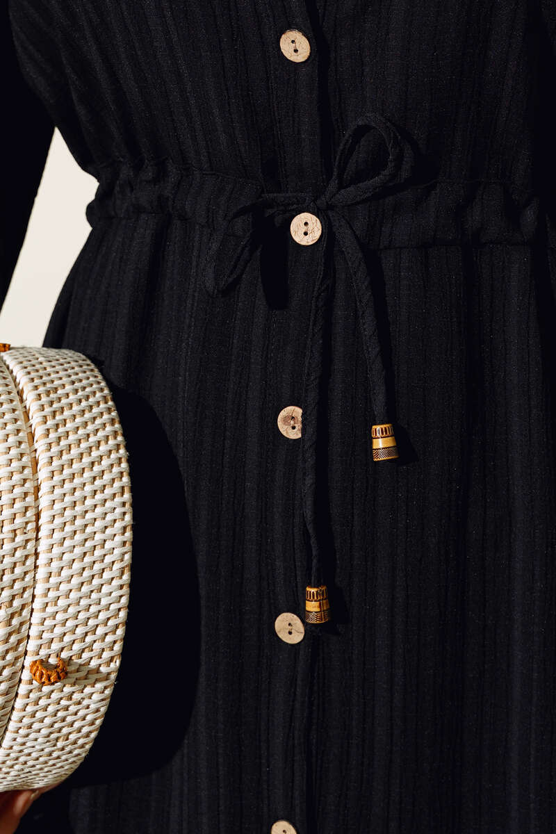 Yeni sezon elbisemiz boydan düğmelidir. Klasik yaka olan elbisemizin bilekleri lastiklidir. Beli tünelli ip bağlamalı olan elbisemizin göğsünde dantel detayı bulunmaktadır.