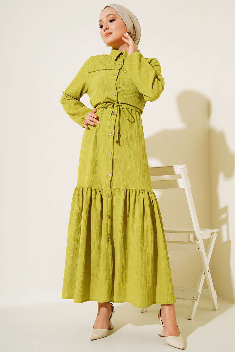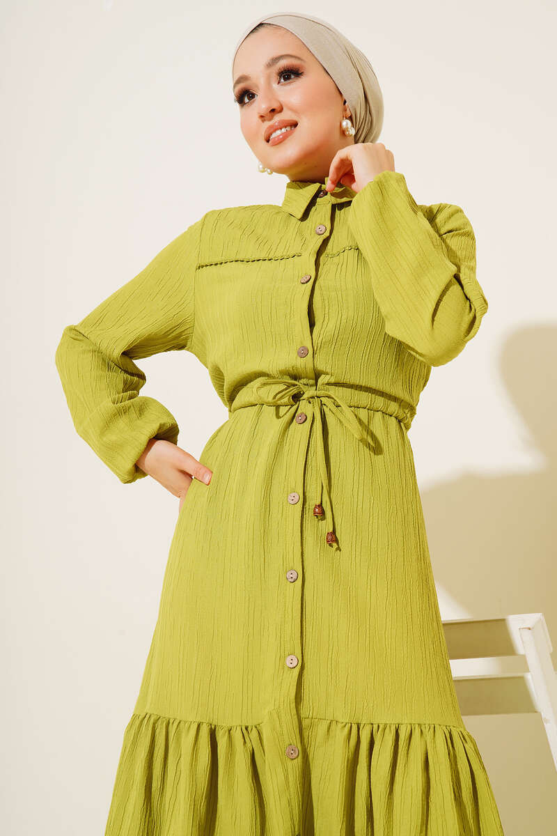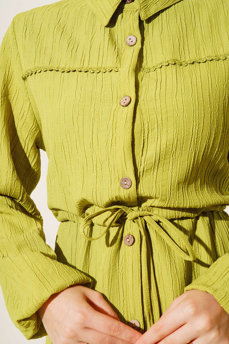 Dantel Detaylı Boydan Düğmeli Elbise Yağ Yeşil
