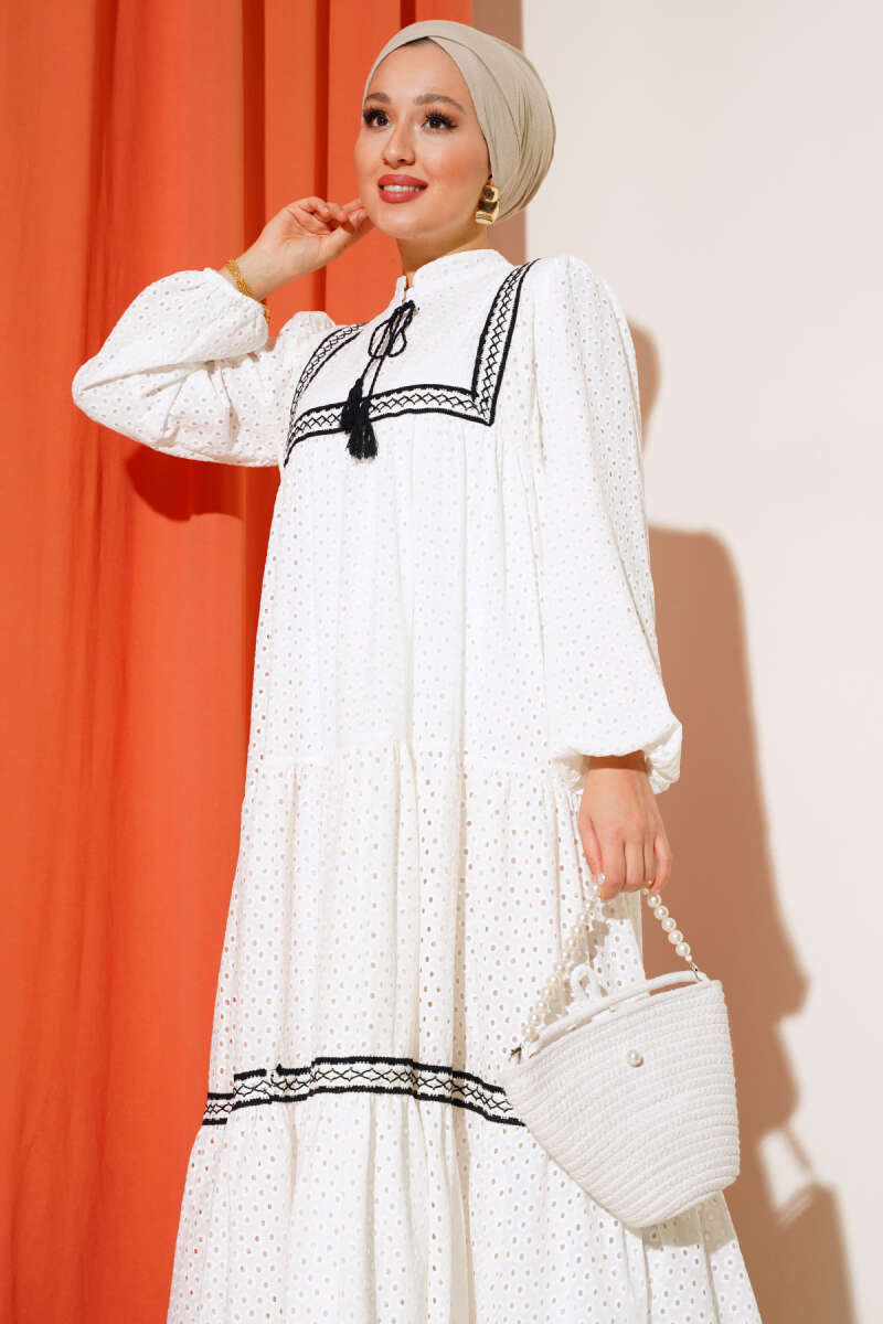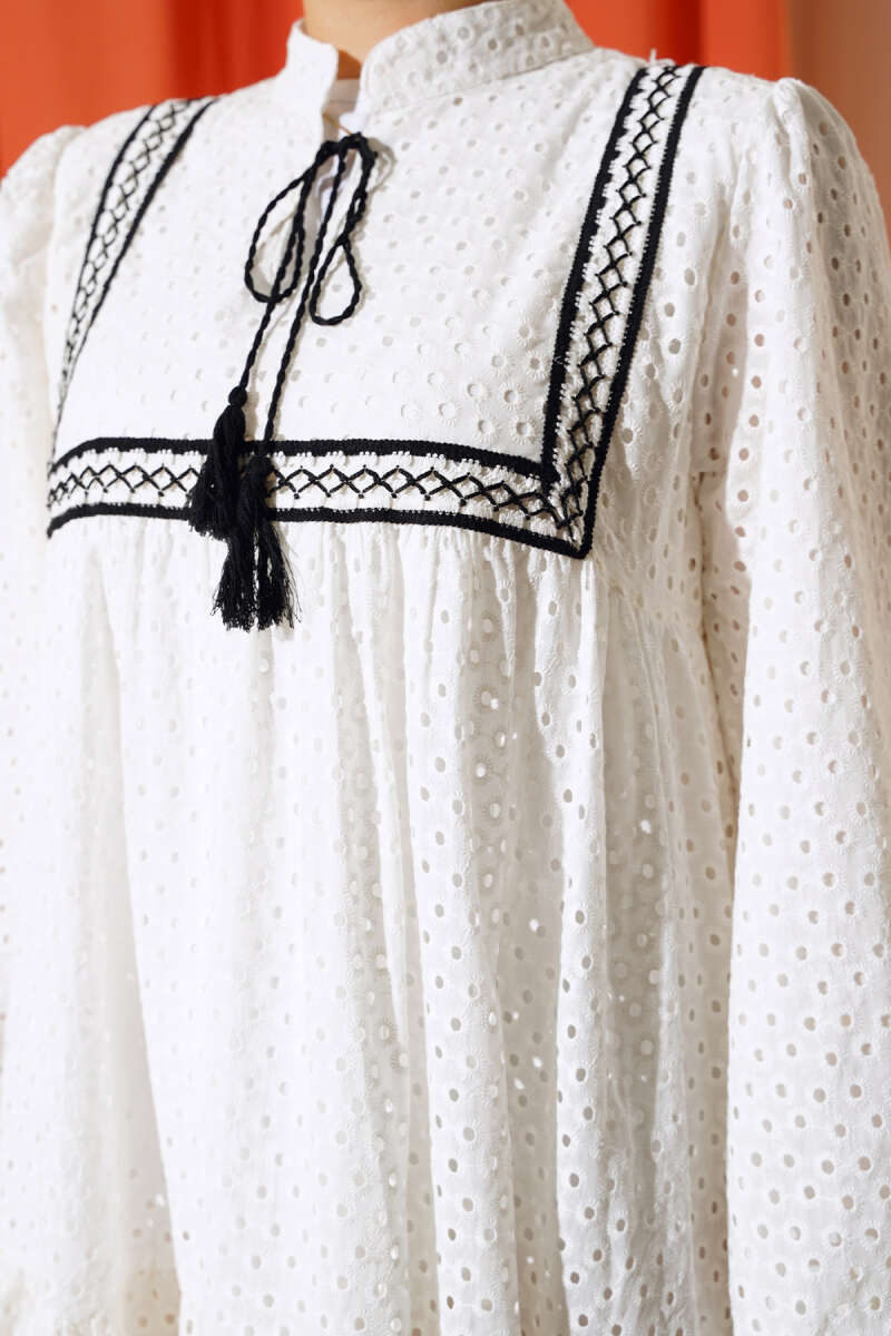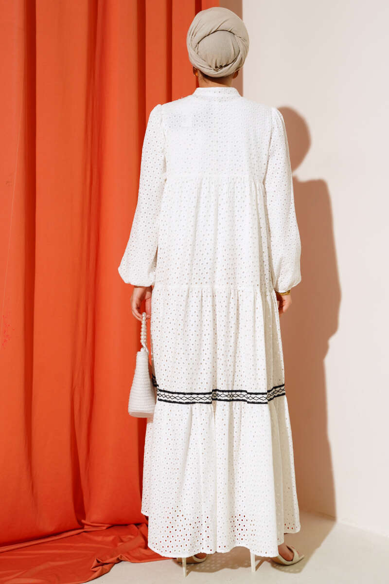 Düğmeli Brode Bilek Lastikli Elbise Beyaz