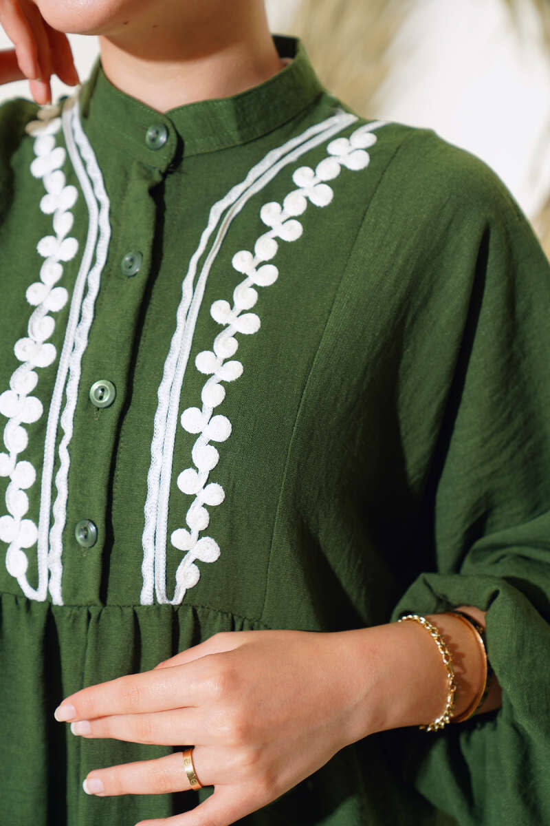 Taşlı Brit Düğmeli Terikoton Gömlek Yeşil