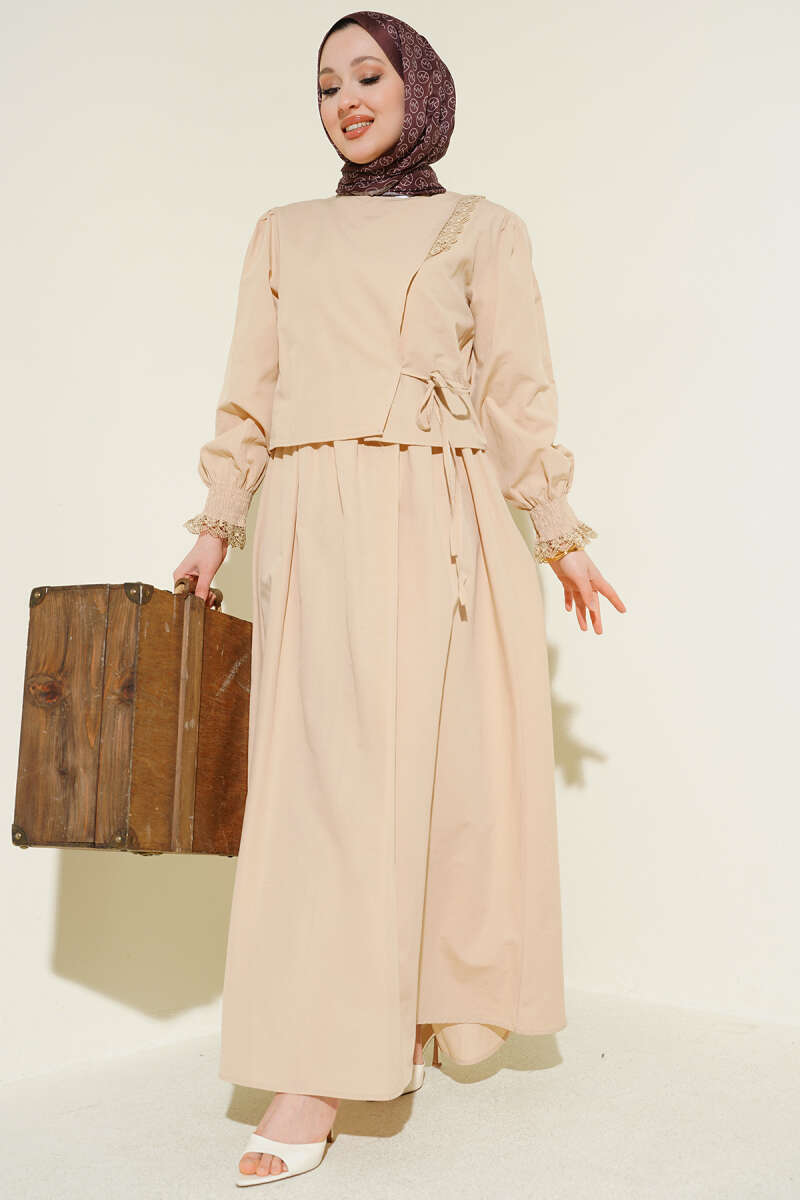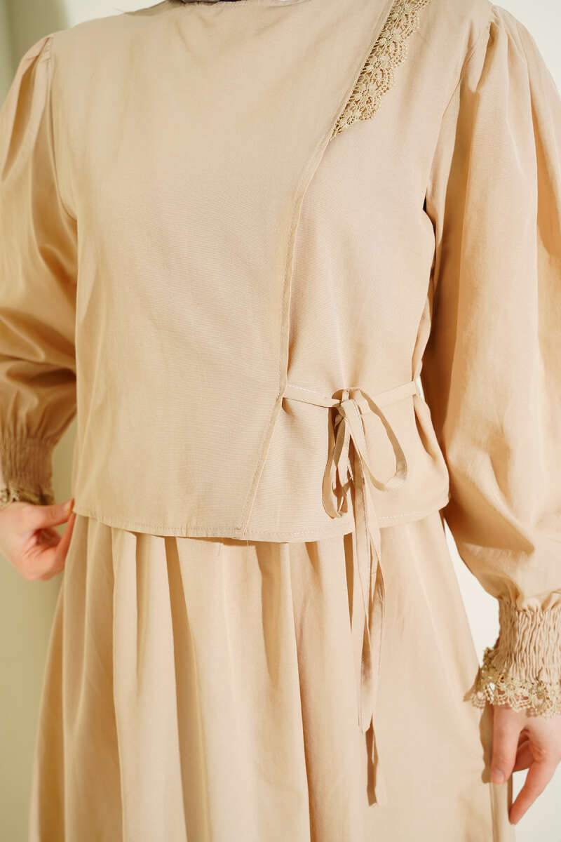 Dantel Detaylı Poplin Jile Elbise Bej
