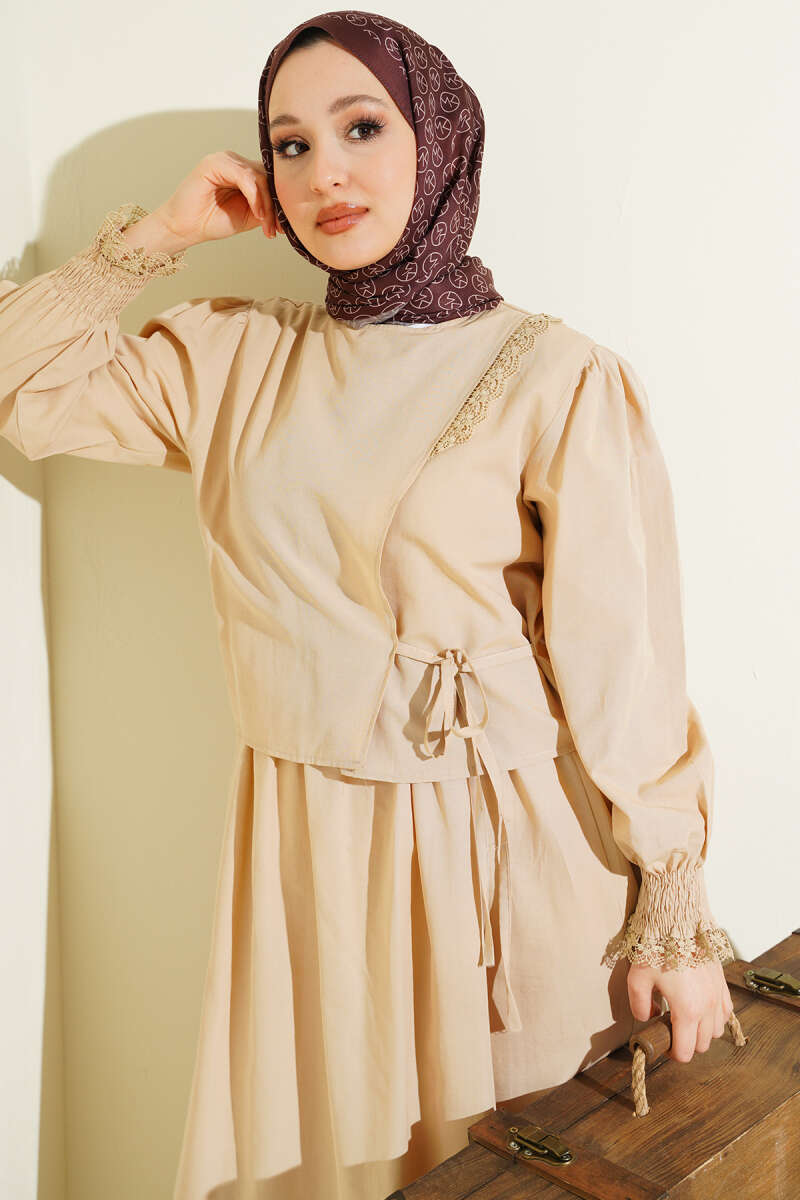 Kuşaklı Mini Taşlı İkili Takım Bej