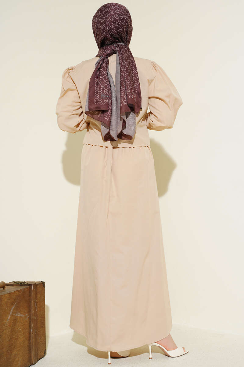 Beli Lastikli Gold Düğmeli İkili Takım Bej