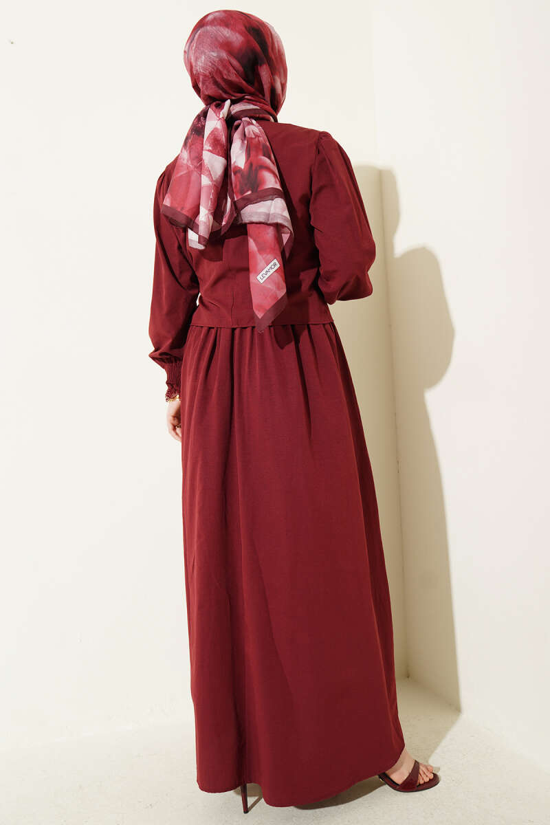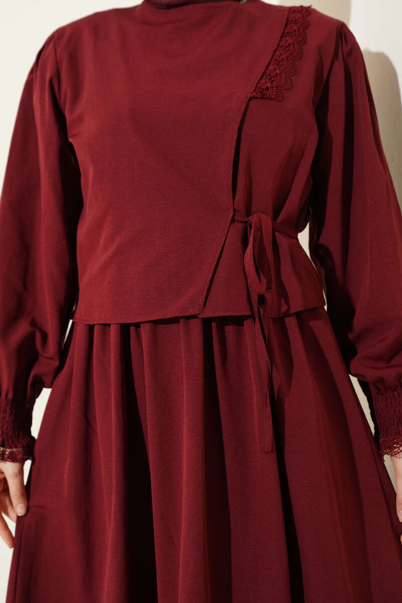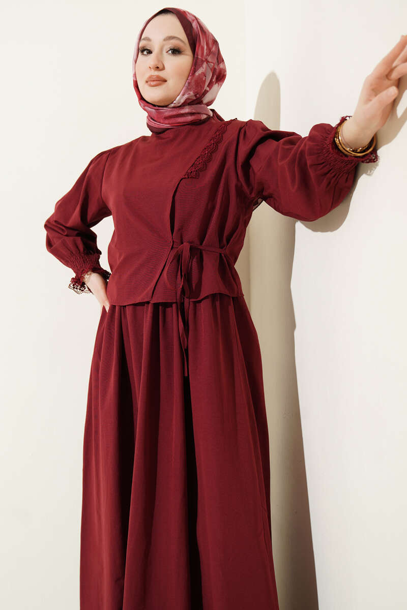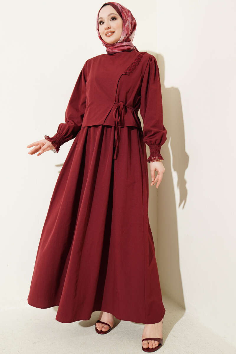Dantel Detaylı Poplin Jile Elbise Bordo