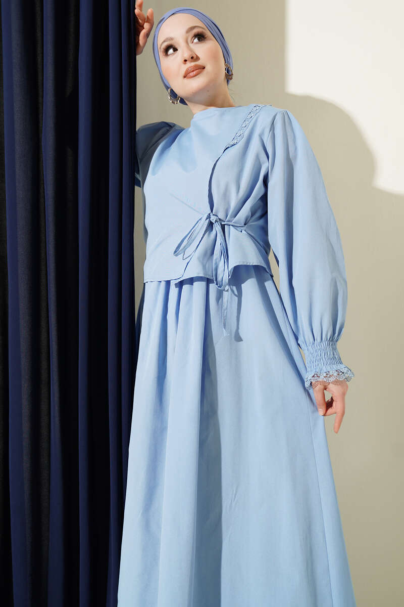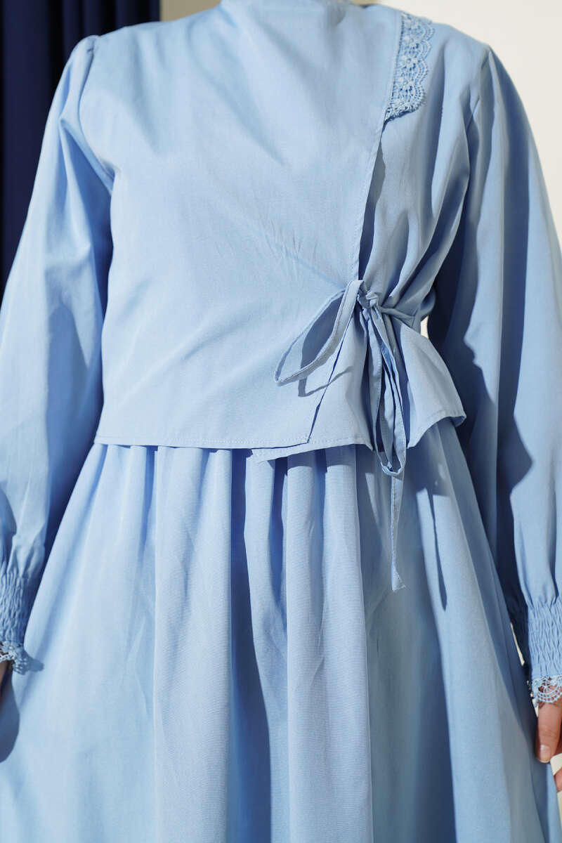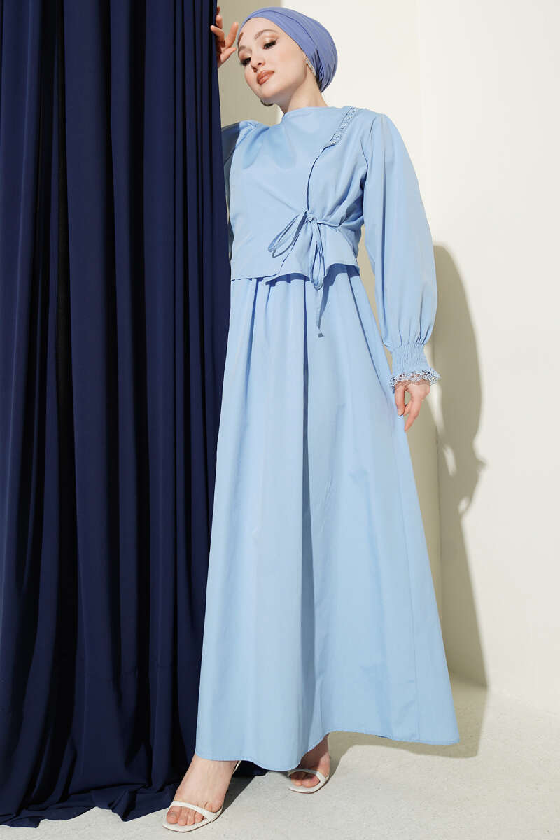Dantel Detaylı Poplin Jile Elbise Buz Mavisi