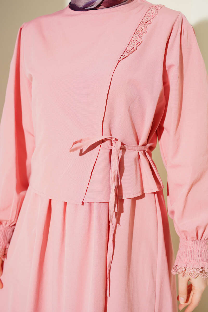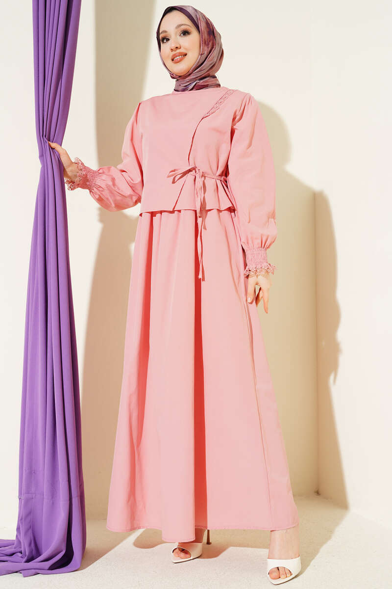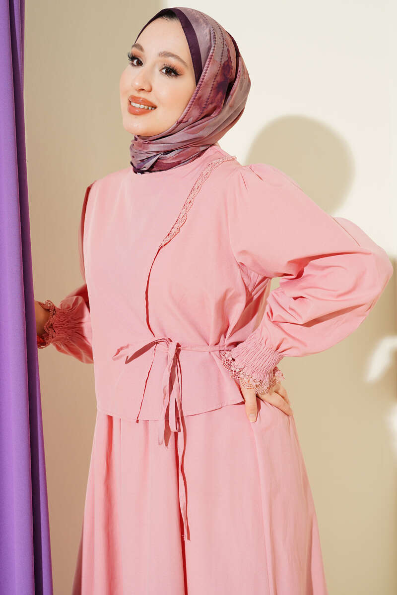 Dantel Detaylı Poplin Jile Elbise Pudra