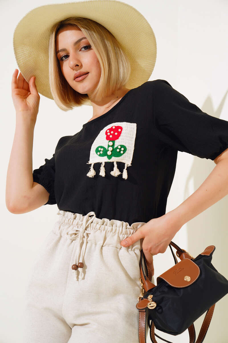 Çantalı Kız Baskılı T-shirt Siyah