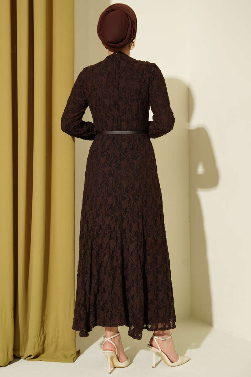 Dantel Kemer Detaylı Elbise Kahve