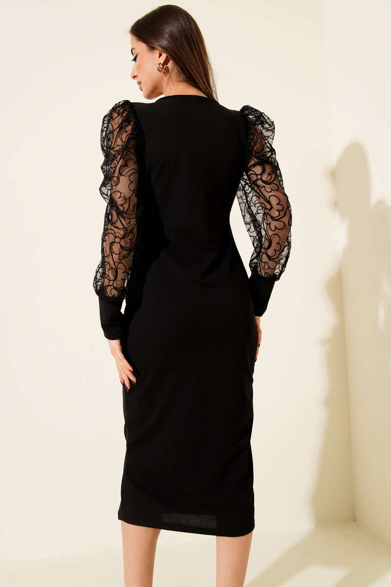 Güneş Aksesuarlı Yırtmaçlı Kadife Elbise Siyah