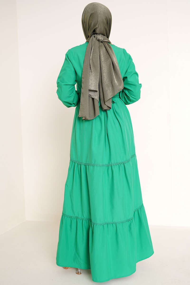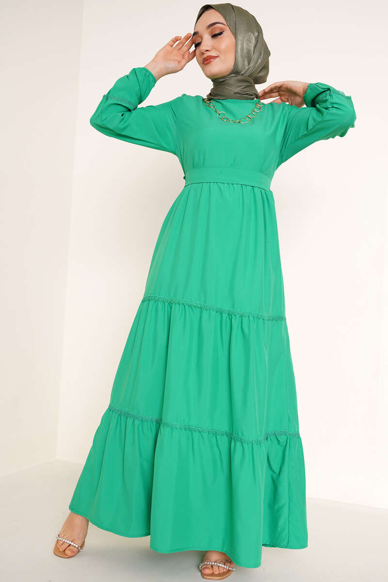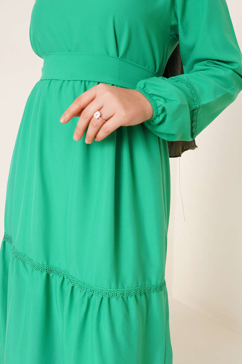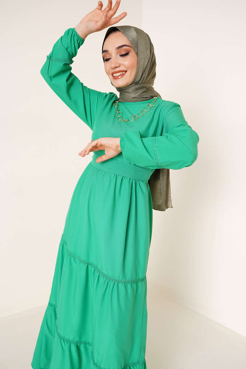 Yeni sezon elbisemiz kat kat modeldir. Katlarda bulunan dantel detaylarına kolundaki dantel detayı da eşlik etmektedir. Oval yaka olan elbisemizin ense düğmesi bulunmaktadır. Beli kuşaklı elbisemizin iki adet kemer köprüsü bulunmaktadır. Bilekleri lastiklidir.