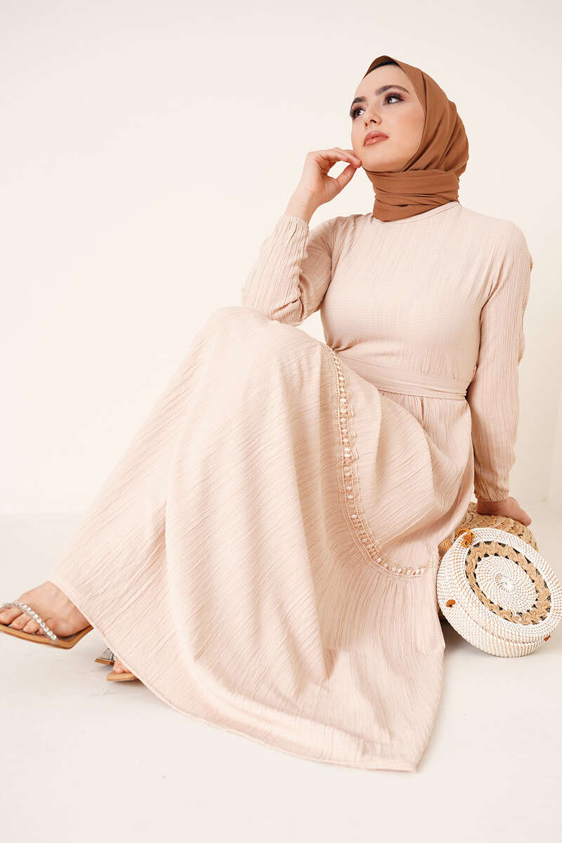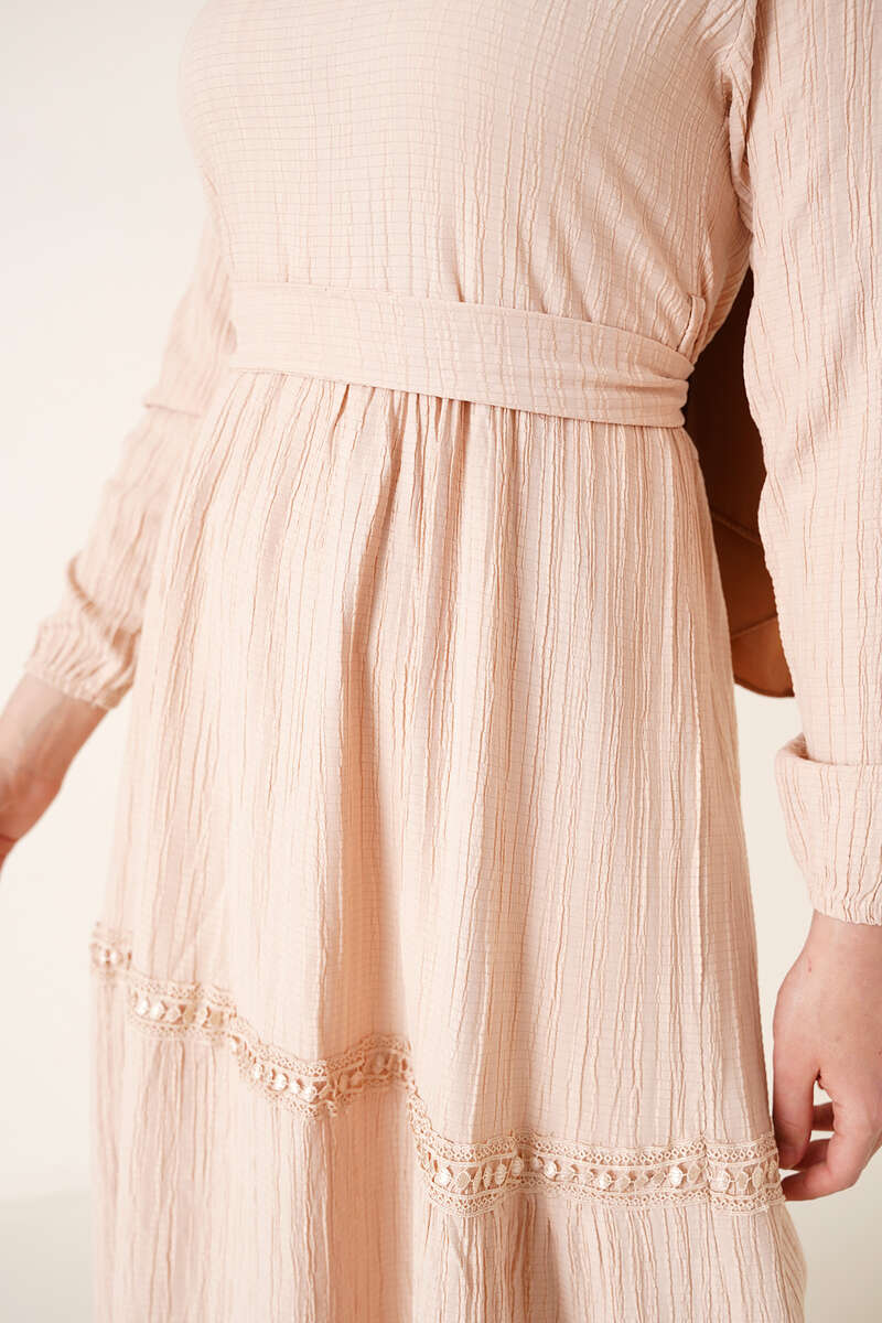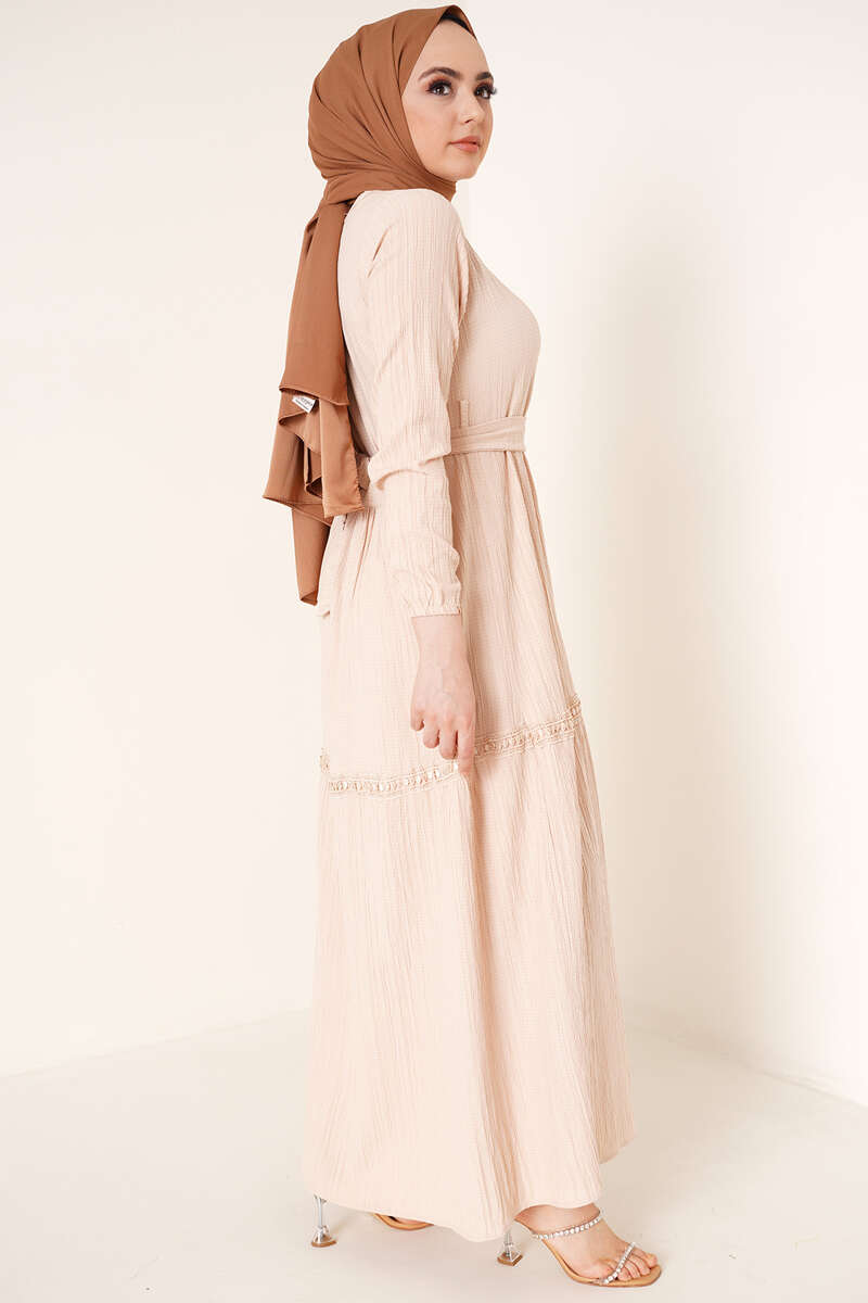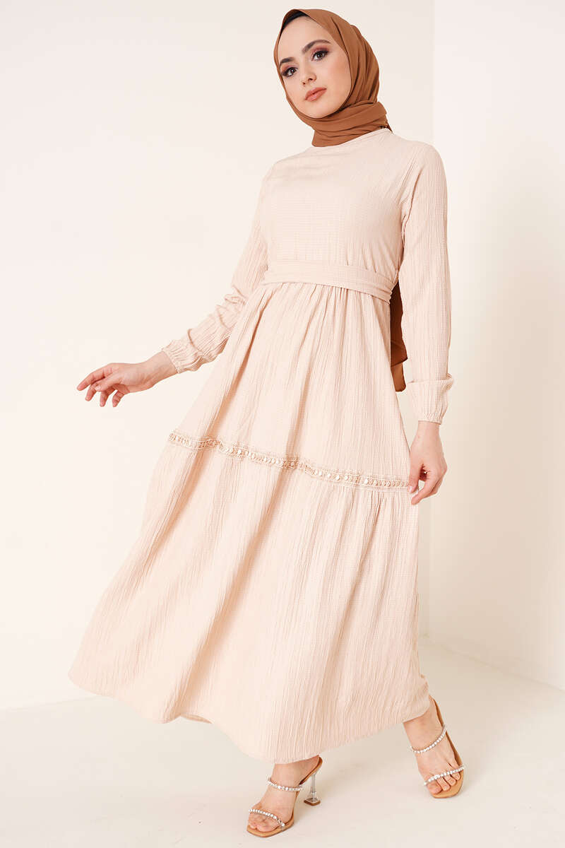 Yeni sezon elbisemiz dantel süslemesiyle beğenilmekte. Elbimiz oval yakadır. Ense düğmesi bulunan elbisemizin beli kuşaklıdır. İki adet kemer köprüsü bulunan elbisemizin bilekleri lastiklidir.