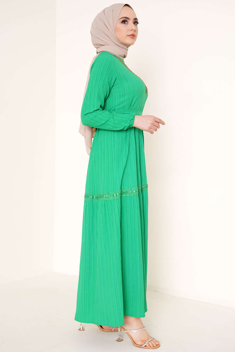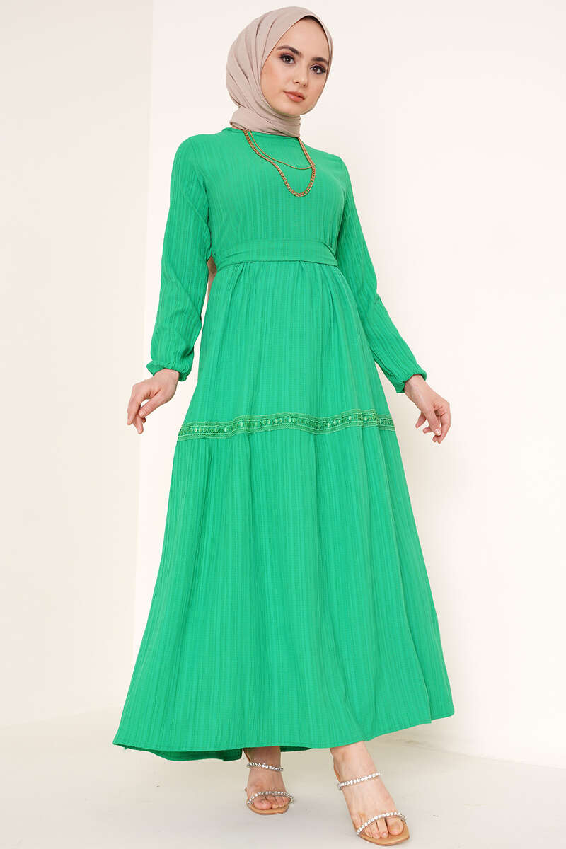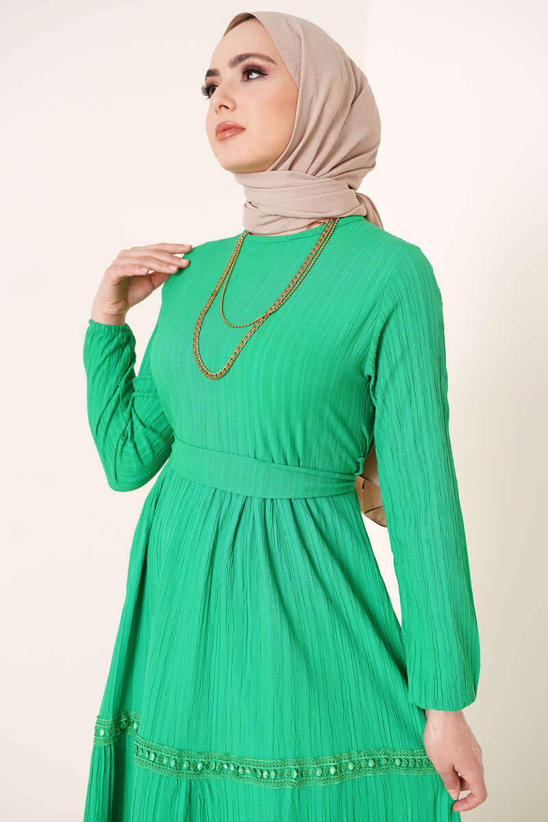 Yeni sezon elbisemiz dantel süslemesiyle beğenilmekte. Elbimiz oval yakadır. Ense düğmesi bulunan elbisemizin beli kuşaklıdır. İki adet kemer köprüsü bulunan elbisemizin bilekleri lastiklidir.