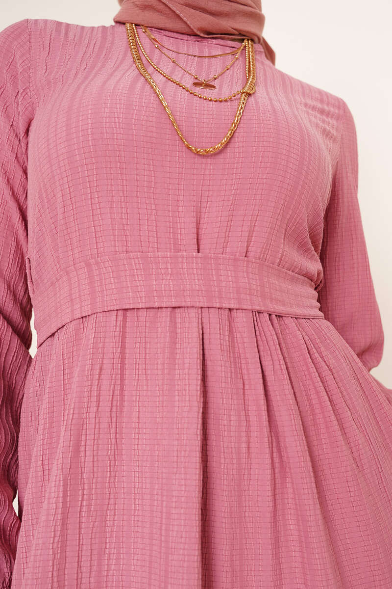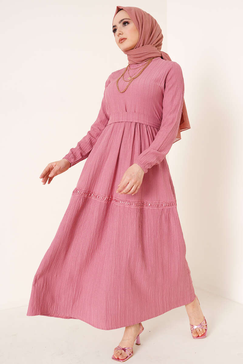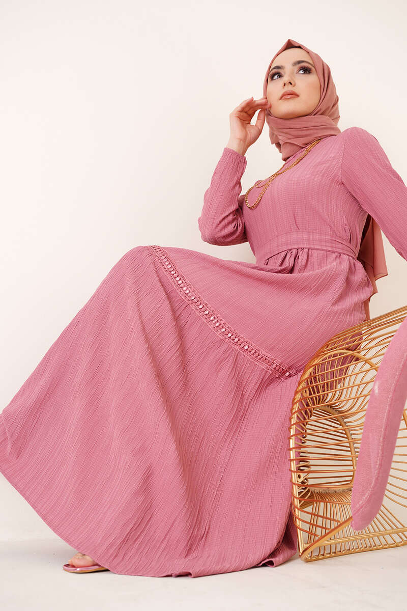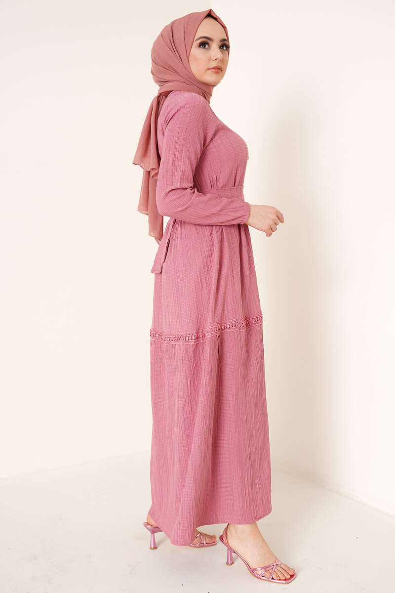 Dantel Süslemeli Kuşaklı Elbise Gül Kurusu